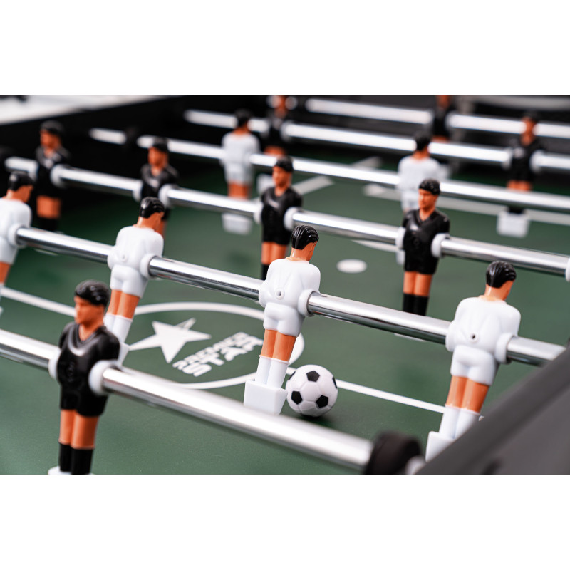 Ігрове поле зеленого кольору - таке нейтральне покриття не відволікає гравців. Поле виготовлено з високоякісної вологостійкої плити МДФ, яка покрита шаром ламінату, щоб зробити його стійким до стирання. Крім того, кути ігрового поля трохи підняті, що забезпечує повний контроль над траєкторією руху м'яча. Фігурки для настільного футболу виготовлені з якісного пластику і встановлені на міцних сталевих напрямних, оснащених спеціальними бамперами. У набір входять три м'ячі.