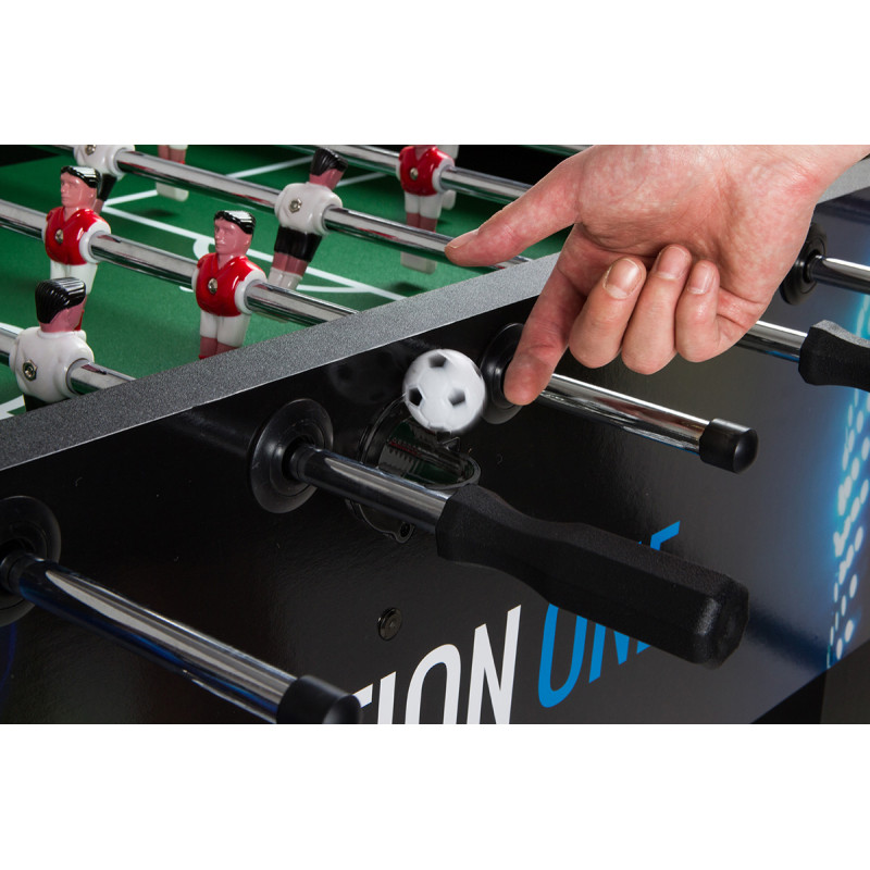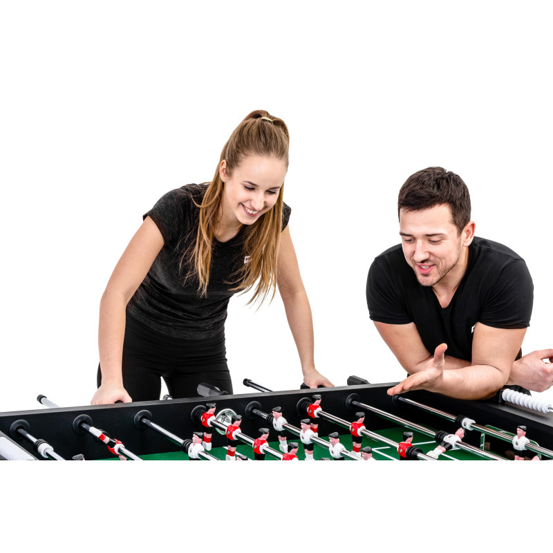 Ігрове поле з нейтральним зеленим покриттям не відволікає гравців та забезпечує повний контроль над траєкторією м'яча. Ручні лічильники голів розміщуються по обидва боки поля. Фігурки для настільного футболу, встановлені на сталевих напрямних, фіксуються гумовими стопорами. Настільний футбол виготовлений із загартованої плити МДФ, покритої шаром ламінату для більшої стійкості до стирання. Фігури гравців розміщуються на столі за системою 3:5:2:1. У набір входять два м'ячі.