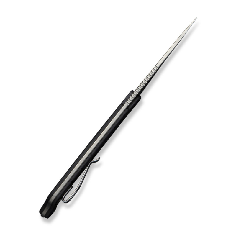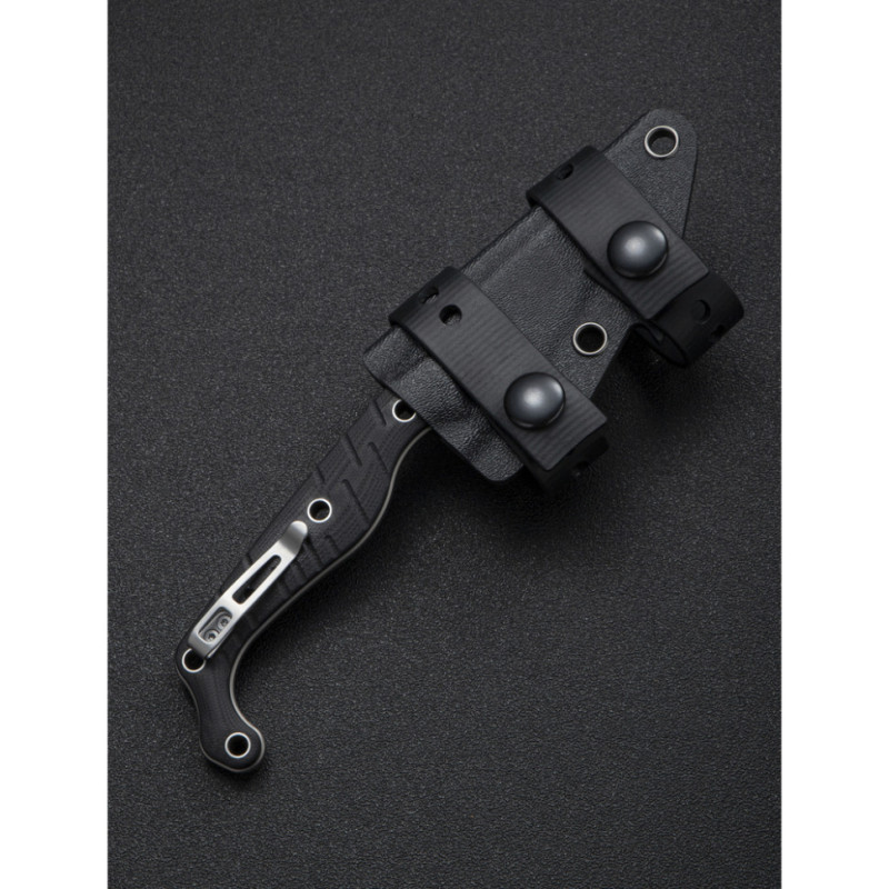 У хвості руківʼя закріплено кліпсу з нержавіючої сталі, орієнтовану на Tip-Down носіння. Затискач забезпечує міцну фіксацію інструмента в кишені або на спорядженні, не виступаючи за межі габаритів. Положення кліпси можна міняти під зручну руку — встановлювати з правого або лівого боку конструкції.