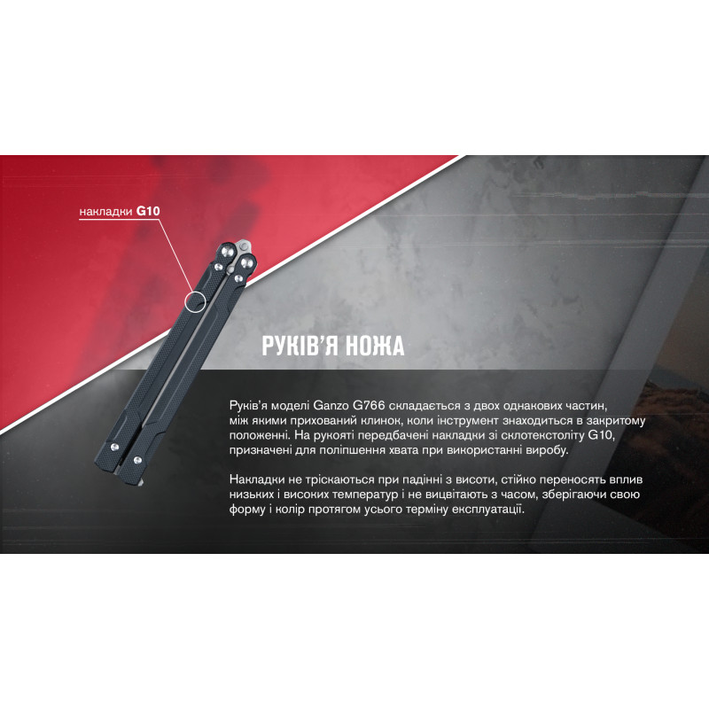 Рукоять, що складається з двох однакових частин, є відмінною рисою балісонгів. Така конструкція дозволяє швидко і ефектно розкрити інструмент менш ніж за секунду. Ніж Ganzo G766 має характерні накладки G10, що мають приємну на дотик шорстку поверхню. Колір накладок може відрізнятися в залежності від моделі, але вони надовго зберігають свій яскравий колір і можуть використовуватися в жорстких умовах. Даний матеріал не сприйнятливий до екстремальних температур і зберігає свою первісну форму, яка продумана таким чином, щоб комфортно лежати в долоні будь-якого розміру.