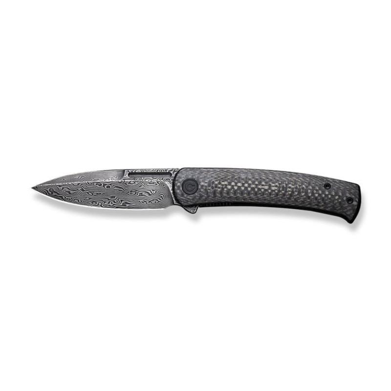 Плашка з карбону з одного боку мінімізує ковзання ножа у долоні. З іншого боку оголена сталева конструкція руківʼя, доповнена кліпсою Tip-Up. Кліпса закріплена двома гвинтами та не передбачає зміни положення.