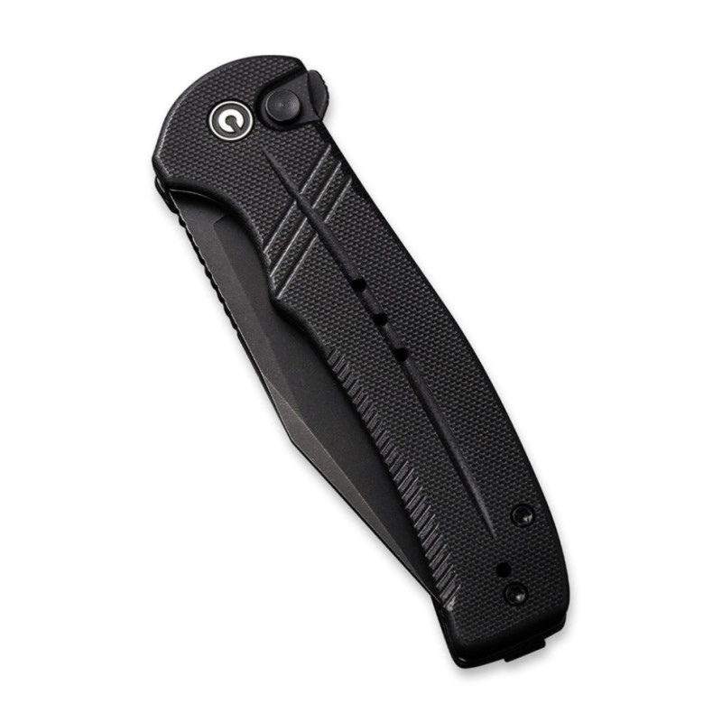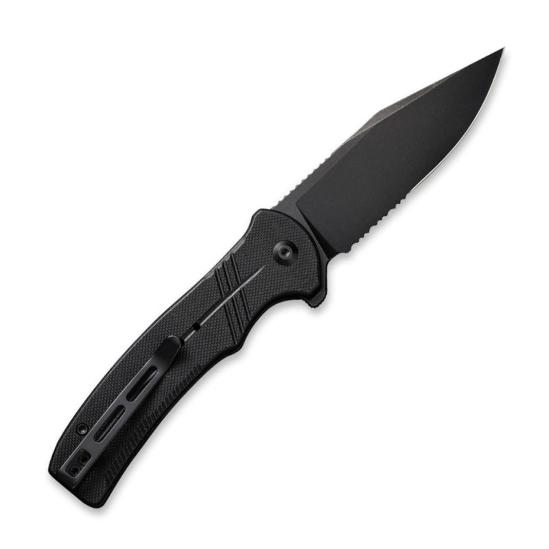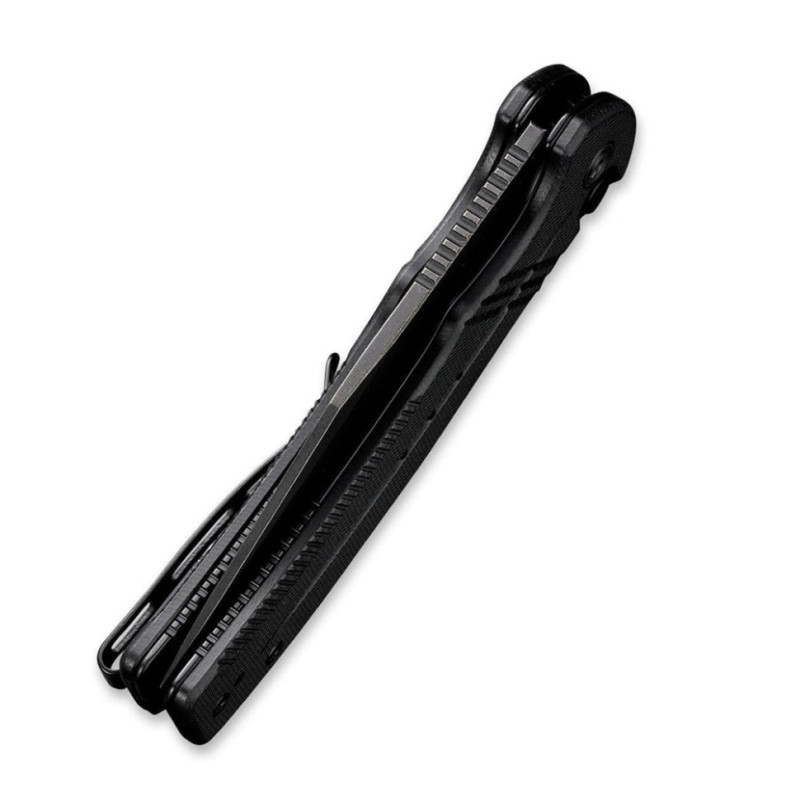 Затискач із нержавіючої сталі закріплений з правого боку руківʼя, але його можна переставити на інший бік, адаптуючи під зручну руку. Щільна посадка унеможливлює випадання інструменту з кишені під час руху, а чорне покриття в тон клинку доповнює загальний дизайн.
