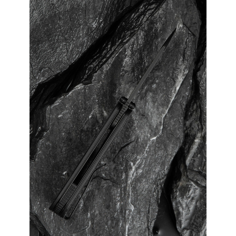 Кліпса з нержавіючої сталі має чорне покриття в тон клинку. Затискач встановлений у положенні Tip-Up під праву руку.