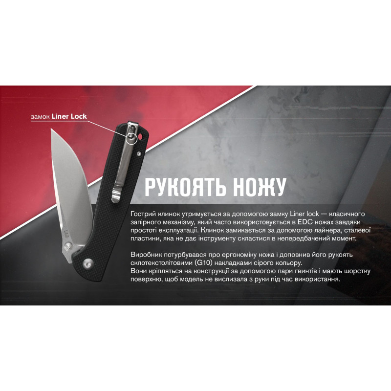 Гострий клинок Ganzo g6805 утримується за допомогою замка Liner lock — класичного запірного механізму, який часто використовується в EDC ножах завдяки простоті експлуатації. Клинок замикається за допомогою лайнера, сталевої пластини, яка не дає інструменту скластися в непередбачений момент.