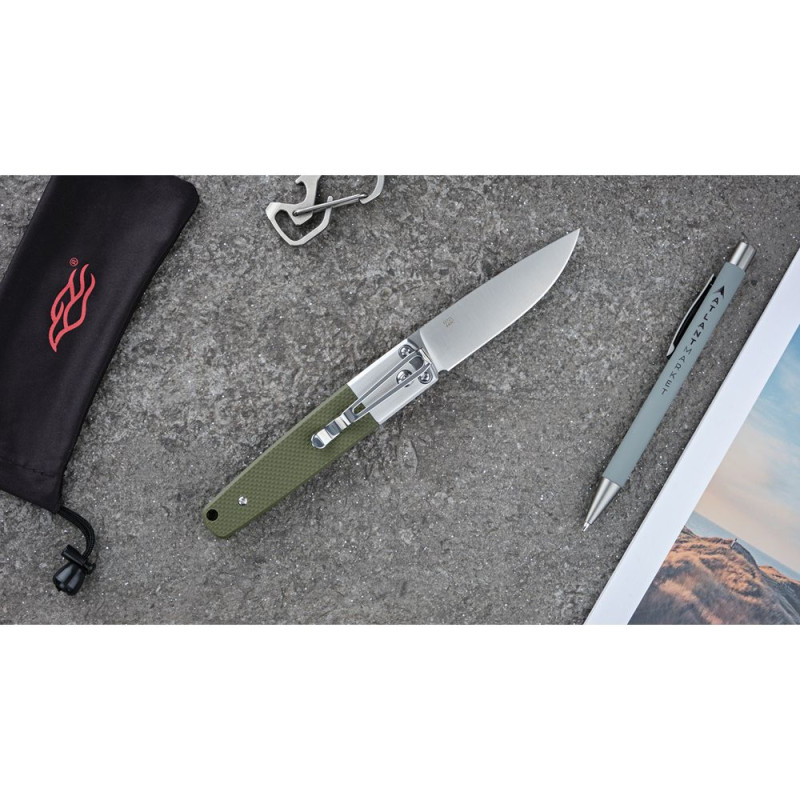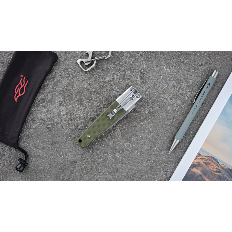 Рукоятка також частково зроблена зі сталі. Другий використовується для її матеріал — сучасний полімер G10. Це дуже міцне і довговічне композитне волокно. Поверхня рукоятки — текстурована, що покращує її зчеплення з долонею. На внутрішній стороні розташована металева кліпса для приєднання до поясного ременя або фіксації в кишені. Ця невелика деталь дозволяє тримати ніж під рукою і не втратити його.