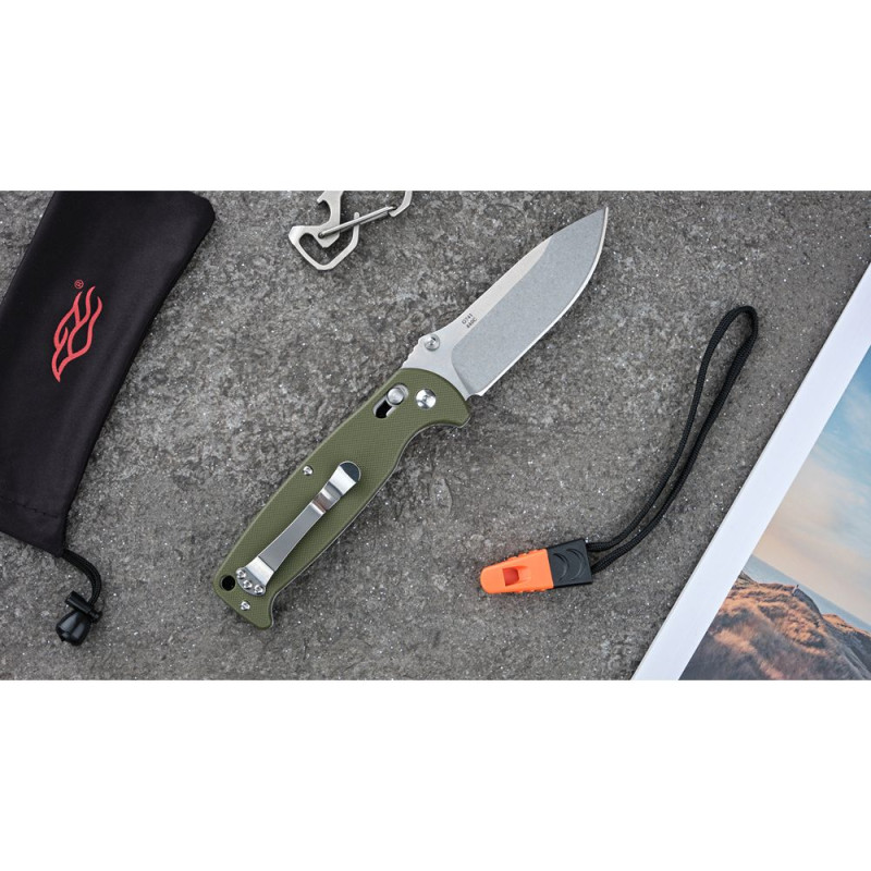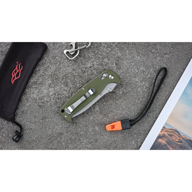 Рукоятка клинка одночасно легка і міцна. Вона зроблена з пластику G10. Покупці можуть вибрати з трьох варіантів забарвлення: чорний, зеленої та помаранчевої. Стиль оформлення — єдиний. Це дві накладки з шорсткою поверхнею, прикручені до сталевій основі. На рукоятці розміщена притискна кліпса темляк-мотузочок, до якого приєднаний свисток.