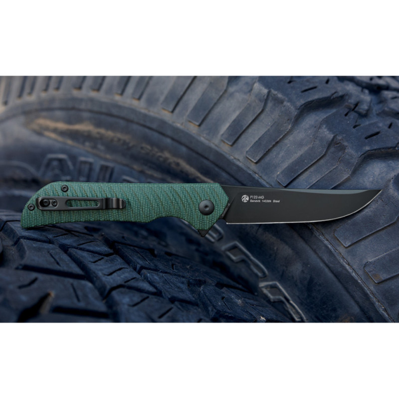Конструкція відкривається натисканням на плавець фліпера, після чого клинок фіксується за допомогою запірної пластини механізму Liner lock. На руківʼї закріплені дві плашки з мікарти, яка протистоїть пошкодженням при механічному впливі, не тріскається у разі різкої зміни температури та не вбирає неприємні запахи. Рельєфна поверхня руківʼя робить утримання міцнішим і зручнішим, навіть якщо ви носите щільні рукавички.