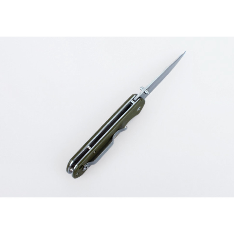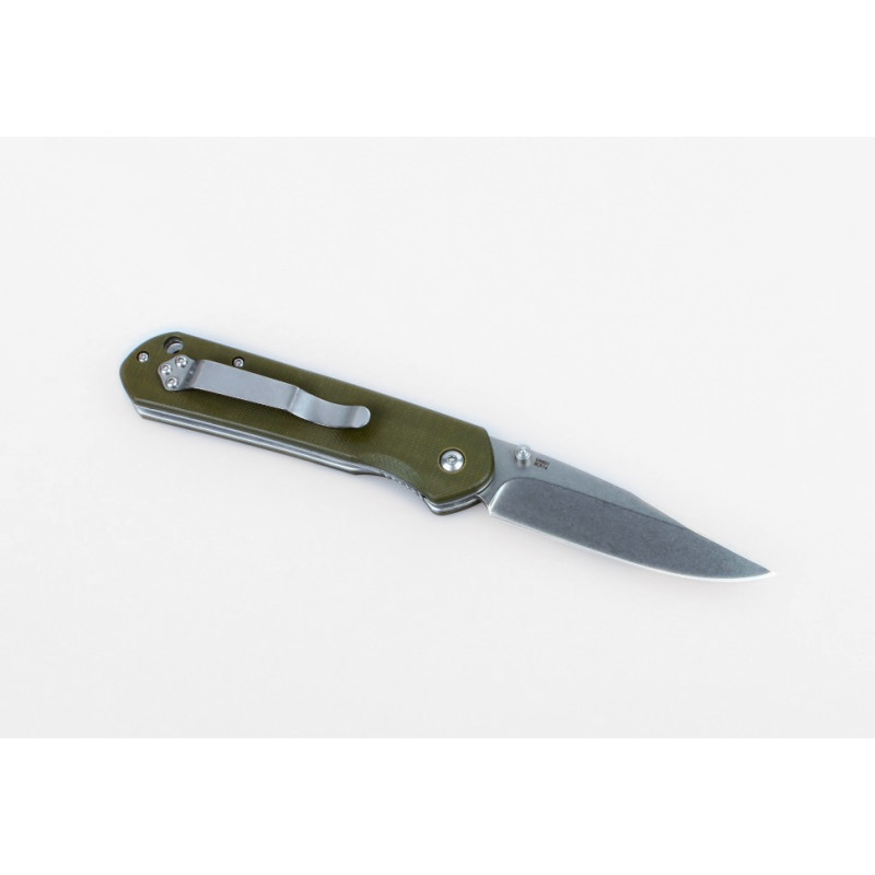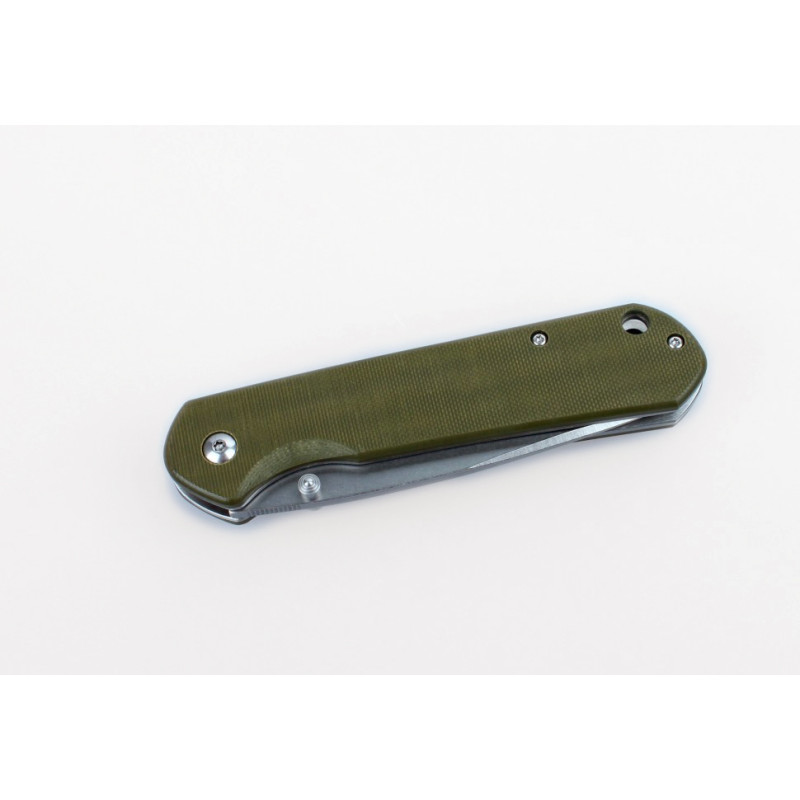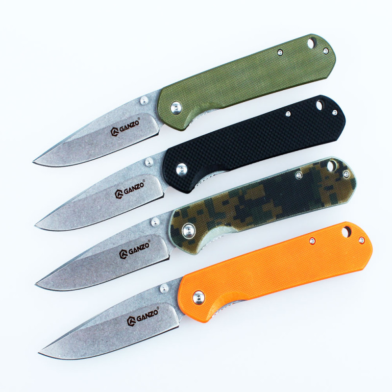 На рукоятці закріплені накладки з термопластика G10. Це міцний композитний матеріал, яких не поступається в надійності сталі. До того ж, він дуже довговічний, стійкий до дії багатьох активних хімічних речовин, не выгорающий на сонці і не усмоктує воду. Поверхня накладок текстурована, щоб ніж можна було міцніше тримати в руках. Також в рукоятку можна втягати ремінець для руки, через спеціально передбачений отвір невеликого діаметру. В кишені або поясному ремені Ganzo G6801 закріплюється за допомогою металевої кліпси. Для вибору доступні чотири варіанти ножів Ganzo G6801: з зеленої, чорної, помаранчевої або камуфляжній рукояткою.