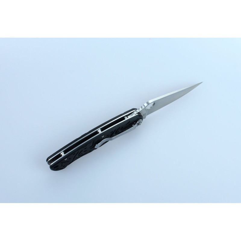 Ніж Ganzo G7301 буде корисний для максимально широкого кола покупців. Його можна використовувати і як міську модель EDC, і в якості туристичного ножа. Цьому сприяло поєднання оригінального сучасного дизайну і якісних матеріалів. Основною функціональною частиною ножа по праву можна назвати його клинок. Цієї деталі виробники приділили особливу увагу, використавши для леза міцну нержавіючу сталь марки 440С. Цей сплав загартований до твердості +-58HRC, завдяки чому ніж довгий час залишається гостро заточеним. У той же час, він добре протистоїть появі іржі і інших проявів корозії, завдяки чому підходить мисливцям, рибалкам і туристам. Лезо ножа гладко заточене і підходить для роботи з харчовими та іншими продуктами. Його довжина становить 88 мм, а товщина по обуху — 3,3 мм. По мірі наближення до рукоятки клинка, він значно розширюється і лінія обуха піднімається. У верхній частині клинка розташований отвір круглої форми, яке як і в ножів Spyderco призначене для відкривання клинка пальцем.