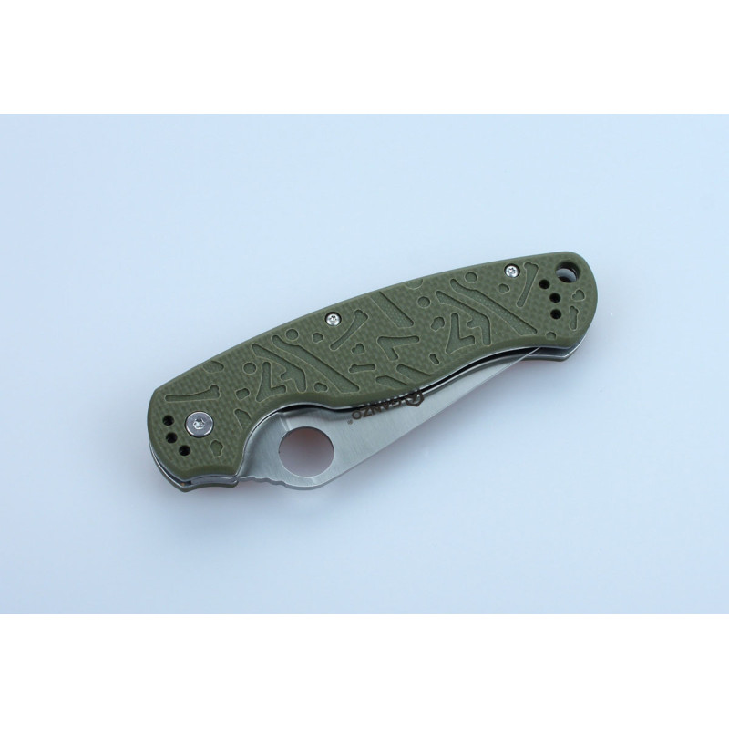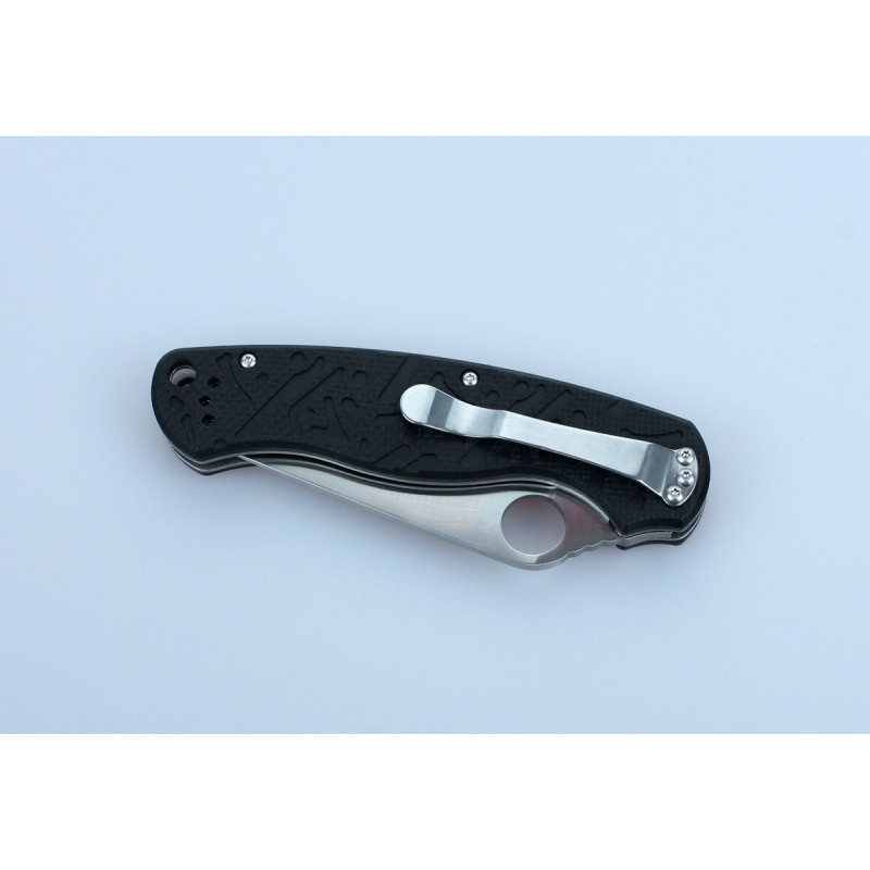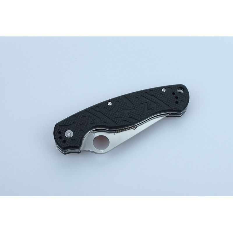 Рукоятка виготовлена з якісного композитного пластику, який складається з скловолокна і епоксидних смол. Цей матеріал наділений великою довговічністю, здатністю протистояти корозії і механічних деформацій. Для вибору доступні три варіанти — з ручкою чорного, зеленого або оранжевого кольору. На її поверхню нанесений фактурний малюнок, який сприяє тому, щоб ніж не ковзав навіть у вологих долонях.Крім того, на рукоятці зроблено невелике наскрізний отвір для закріплення страхувального ремінця на руку і розташована металева кліпса для фіксації ножа в кишені.