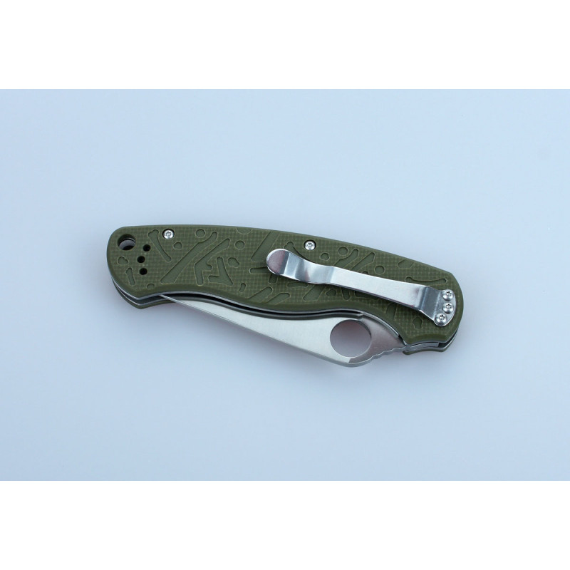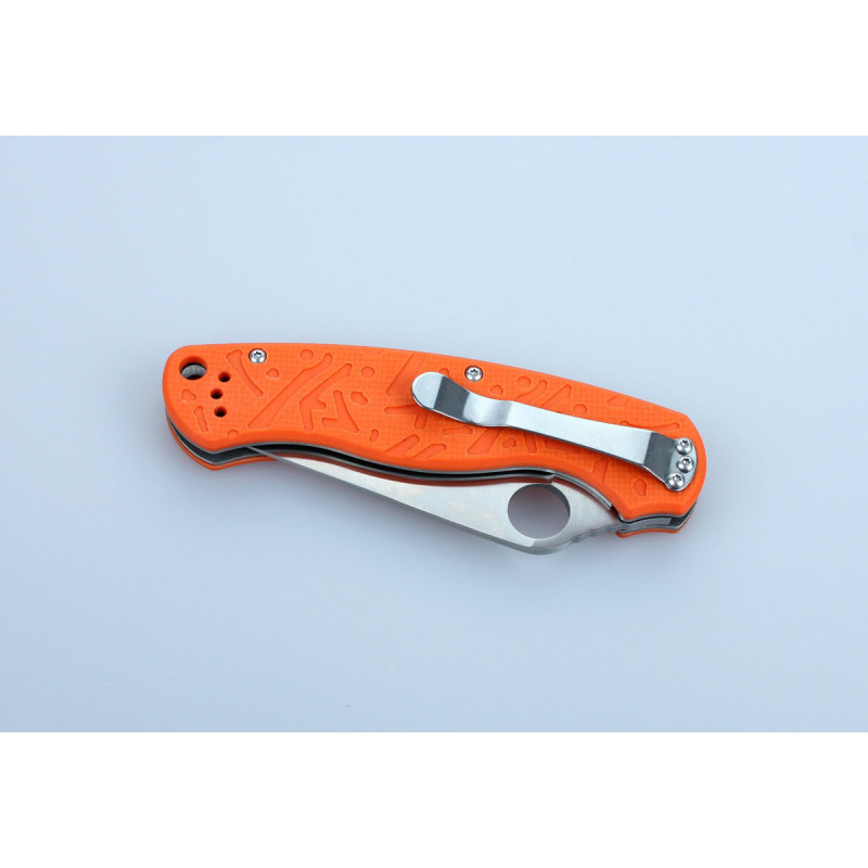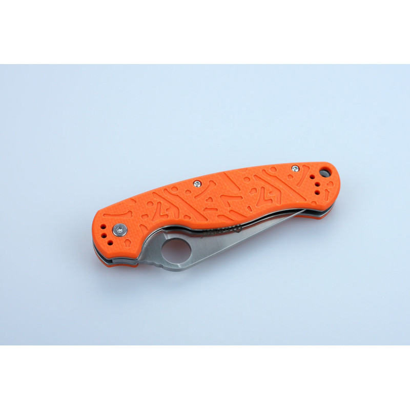 Рукоятка виготовлена з якісного композитного пластику, який складається з скловолокна і епоксидних смол. Цей матеріал наділений великою довговічністю, здатністю протистояти корозії і механічних деформацій. Для вибору доступні три варіанти — з ручкою чорного, зеленого або оранжевого кольору. На її поверхню нанесений фактурний малюнок, який сприяє тому, щоб ніж не ковзав навіть у вологих долонях.Крім того, на рукоятці зроблено невелике наскрізний отвір для закріплення страхувального ремінця на руку і розташована металева кліпса для фіксації ножа в кишені.