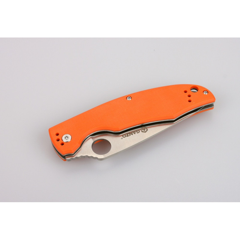 Клинок в моделі Ganzo G732 отримав довжину 95 мм і товщину 0,33 див. До рукоятці він стає значно ширшим. А біля основи леза, ближче до обуха, розташовується отвір, що грає роль шпенька для відкривання ножа. Щоб Ganzo G732 можна було використовувати в максимальній кількості ситуацій, лезо універсально заточене — гладко.