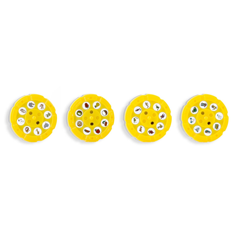 Чому варто обрати проектор? До 32 картинок у комплекті! (барвисті картинки-накладки тематичні: динозаври, транспортні засоби, фрукти та овочі, тварини), проектор довговічний, розваги на довгі години!
