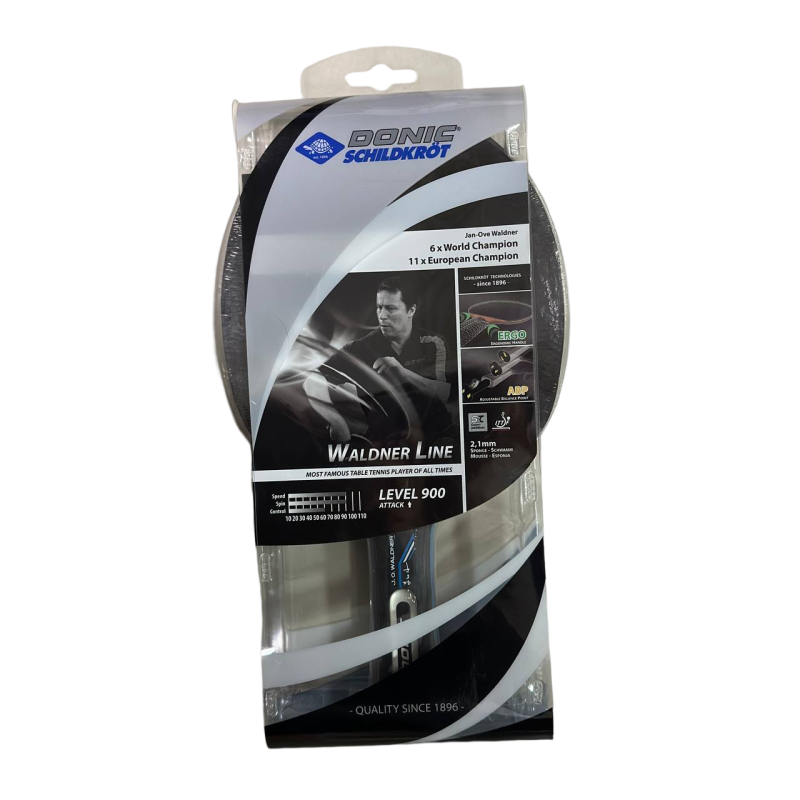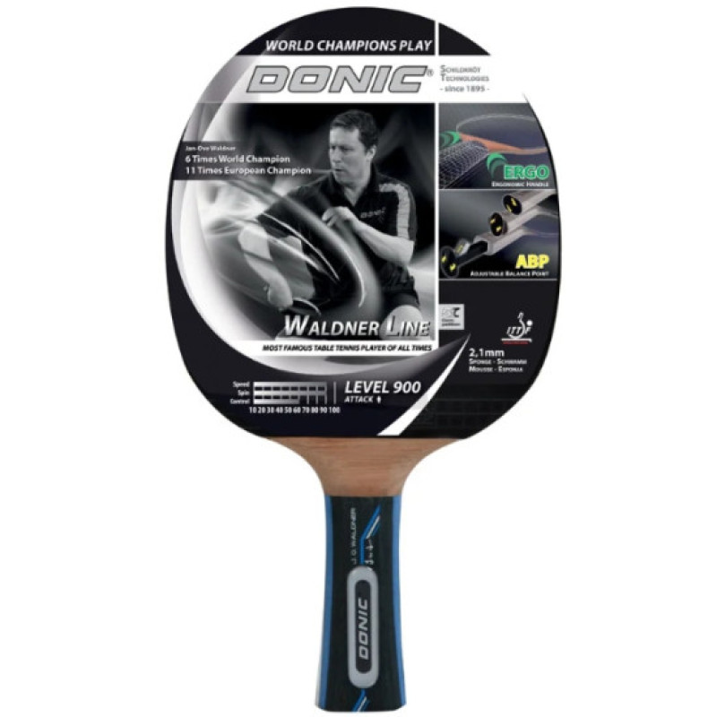 Ракетка для настільного тенісу Donic Waldner 900 — ця ракетка змагального рівня має виняткову якість виготовлення. Основа ракетки складається з 5 шарів, включаючи 2 карбонові кулі, що в поєднанні з губкою толщиною 2.1 мм і накладками Easy Slick роблять ракетку агресивною і атакувальною, що водночас вирізняється гарним контролем. У цій ракетці застосовано одразу кілька революційних технологій: технологія ABP (Adjustable Balance Point), що дає змогу з точністю відрегулювати баланс під свій стиль гри, технологію PLS (Power Lite System), що допомагає суттєво знизити вес ракетки та покращити показники швидкості та балансу.