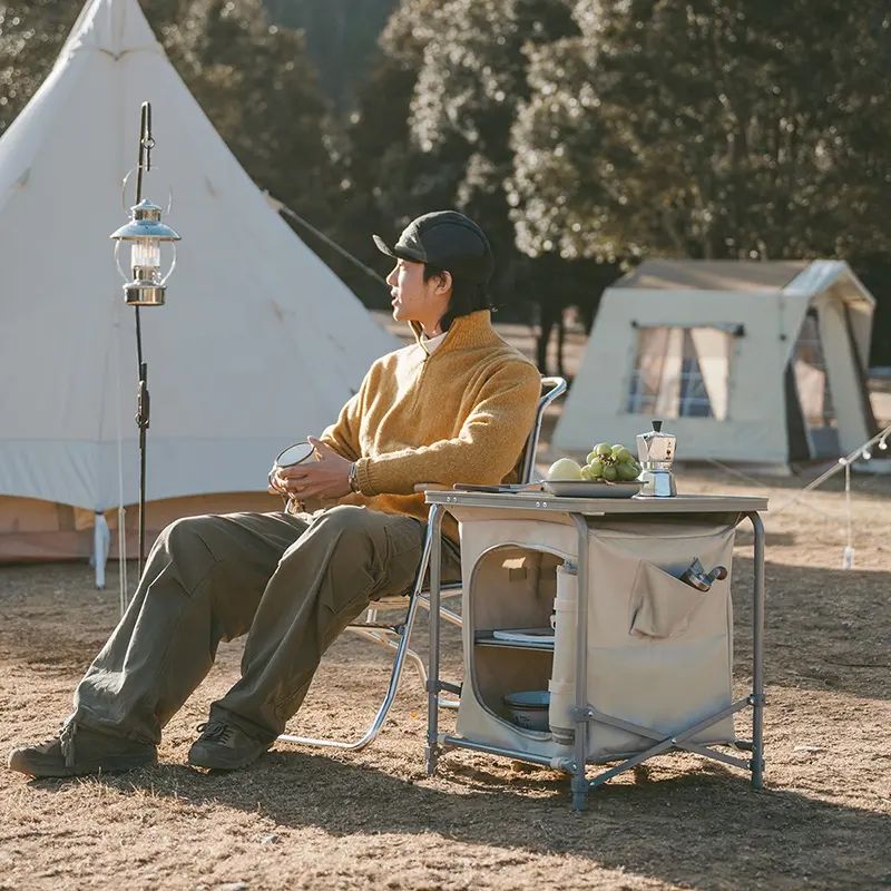 Складаний стіл CNH22JU031 має три поверхні для зберігання похідного приладдя: стільницю та дві внутрішні полички. Загальна місткість моделі сягає 100 л.