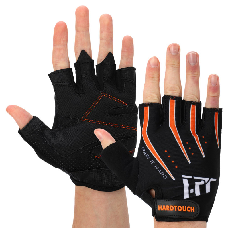 Перчатки для фитнеса и тренировок HARD TOUCH FG-005 (PVC, PL, открытые пальцы, р-р S-XL, черный-оранжевый)