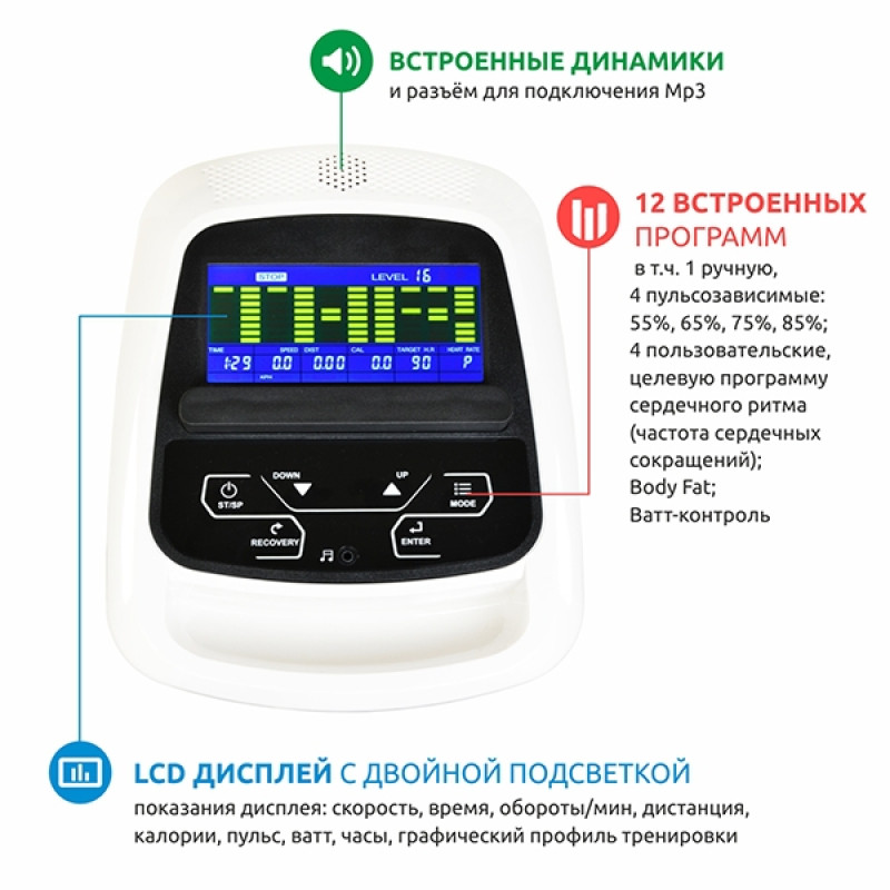 - Программный модуль имеет 12 встроенных программ, в т.ч. 1 ручную, 4 пульсозависимые: 55%, 65%, 75%, 85%; 4 пользовательские, целевую программу сердечного ритма (частота сердечных сокращений); Body Fat; Ватт-контроль;