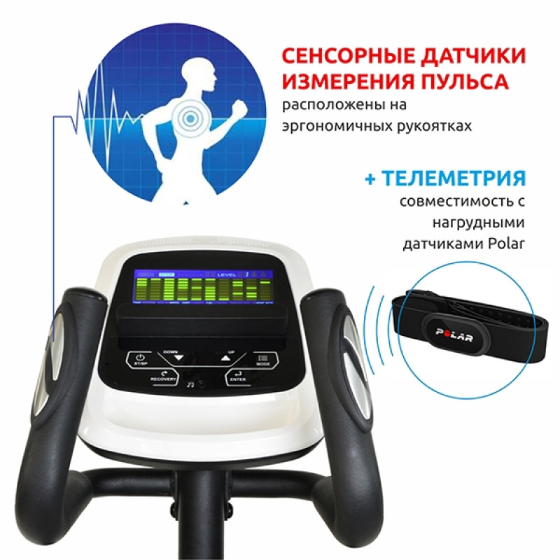 - Сенсорные датчики измерения пульса расположены на эргономичных рукоятках + телеметрия (совместимость с нагрудными датчиками Polar). Внутренняя цифровая система измерения пульса имеет высокую помехоустойчивость;