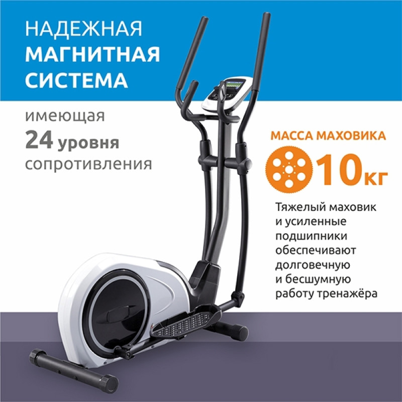 - Надежная магнитная система, имеющая 24 уровня сопротивления, тяжелый маховик и усиленные подшипники обеспечивают долговечную и бесшумную работу тренажёра, плавный и мягкий ход педалей;