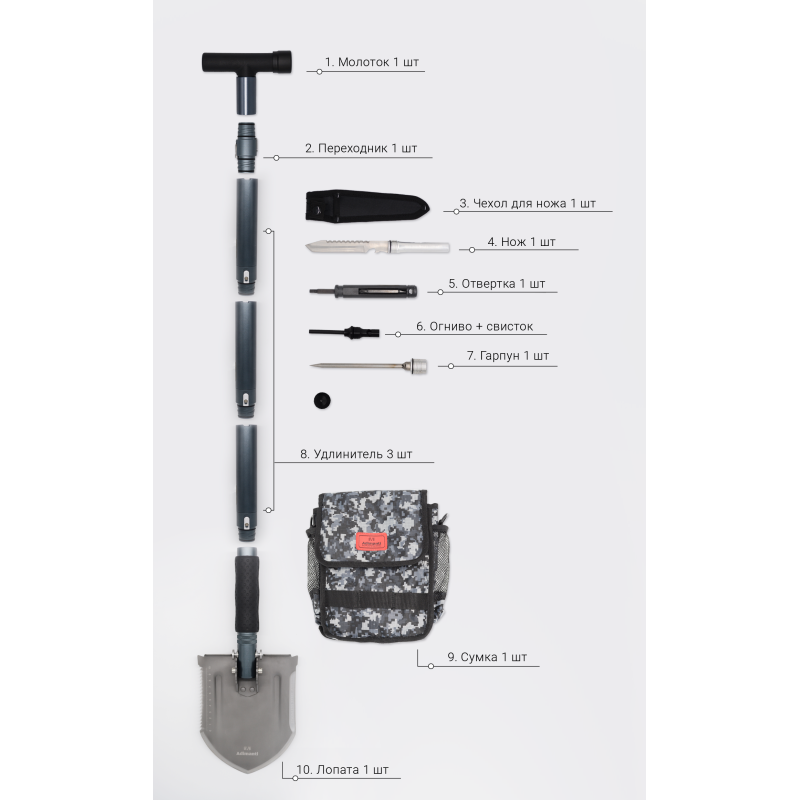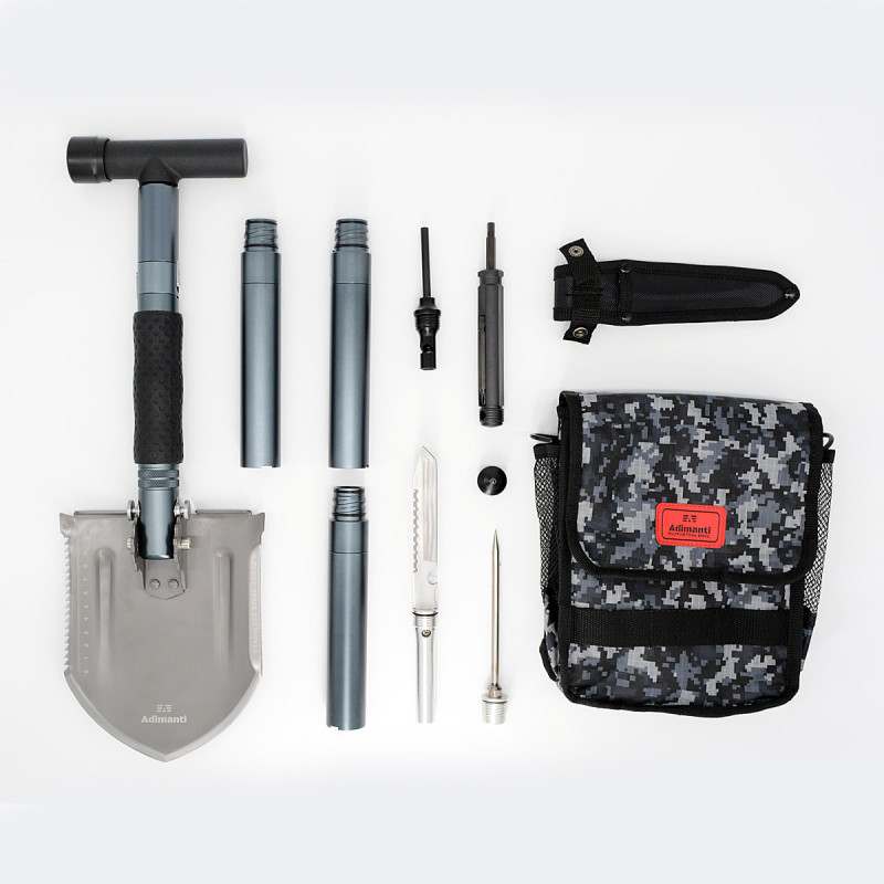 Лопата Adimanti AD-110A — надійний інструмент, який може подорожувати разом з вами, не займаючи багато місця і не обтяжуючи зайвою вагою. У розібраному вигляді лопата поміщається в невелику поясну сумку, а в робочий стан наводитися за лічені хвилини.