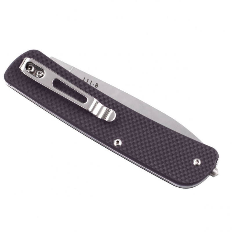 Накладки на рукоять виготовлені з зносостійкого полімерного матеріалу G10, який славиться своєю міцністю і довговічністю. А завдяки фактурної поверхні і ергономічною формою рукояті, модель L11 зручно утримувати практично будь хватом. В асортименті нашого інтернет-магазину представлено 3 варіації даного ножа: з чорними, коричневими і темно-зеленими накладками на рукоять.