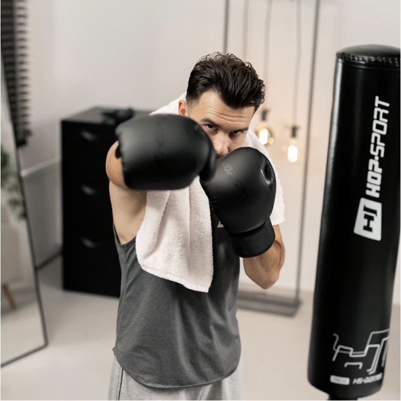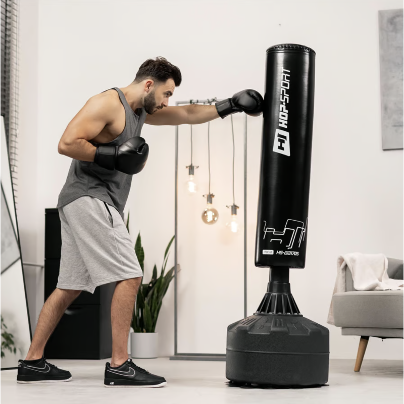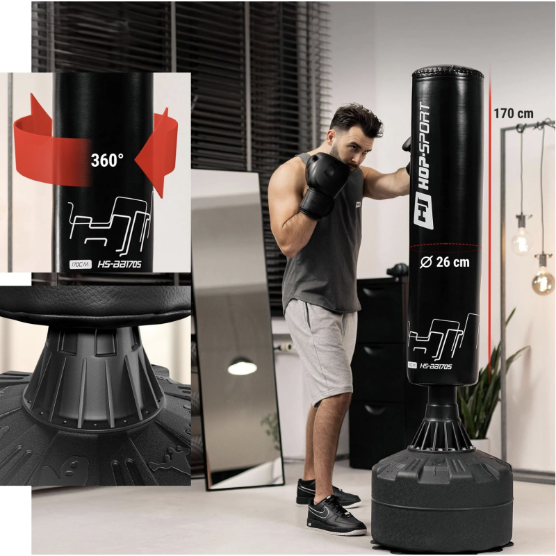 Напольный боксерский мешок Hop-Sport высотой 170см и диаметром 26см - это универсальный спортивный инвентарь, созданный не только для совершенствования техник боевых искусств, но и для поддержания тренировок, направленных на развитие силы и улучшение координации. Благодаря использованию технологии Anti-shock, мешок эффективно поглощает вибрации во время ударов, что позволяет снизить нагрузку на суставы. Функция вращения на 360 градусов добавляет реалистичности тренировочным сессиям, имитируя динамику реального боя.