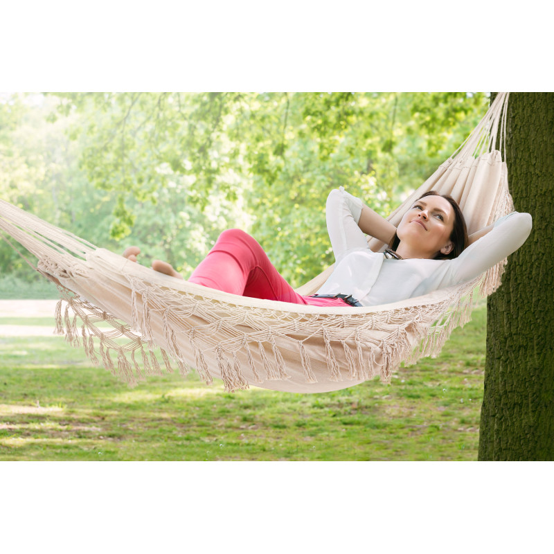 Хотите понежиться на солнышке или отдохнуть в тени, размеренно покачиваясь в такт малейшего дуновения ветра? Тогда бразильский гамак Di Volio Bari - именно то, что вам нужно. Комфортный, стильный и надежный гамак станет не только идеальным украшением вашего сада или дворика, но и отличным местом для отдыха и внутренней релаксации. Его оригинальный дизайн привнесет экзотические нотки во внешнее убранство локации для релакса, будь то веранды или сада. Кружевное плетение, изысканные кисточки, свободно ниспадающие с обеих сторон, делают его замечательным напоминаем о Бразилии. Купить бразильский гамак Di Volio Bari - значит выбрать качество и надежность по весьма доступной цене. Прочная конструкция обладает довольно хорошей грузоподъемностью и обеспечивает пользователю полнейшую безопасность. А основное полотно Bari, сделанное исключительно из качественных материалов (хлопок и полиэстер), дарит комфорт и гарантирует длительный срок службы.