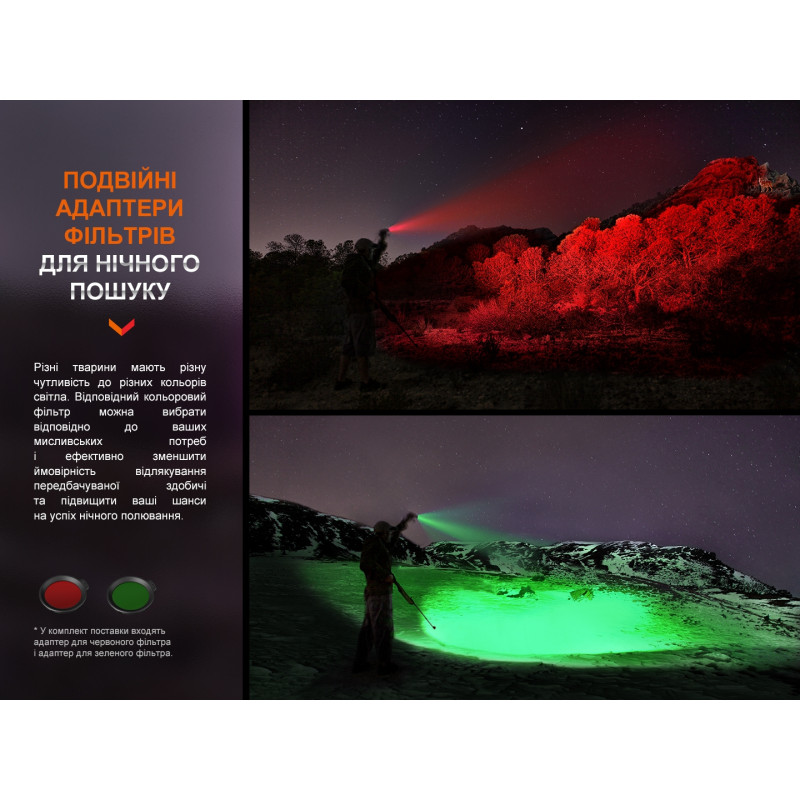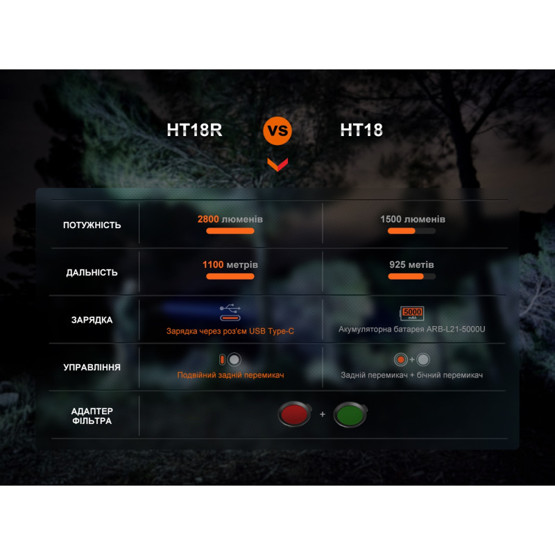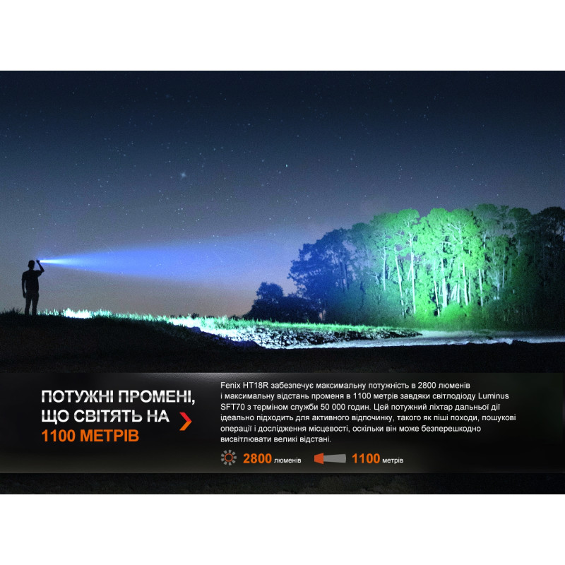 Модель Fenix HT18R поєднує в собі всі необхідні характеристики, які повинен мати мисливський ліхтар. Виняткову яскравість світла, що досягає 2800 люмен, забезпечує високопродуктивний світлодіод Luminus SFT70 (6500К), а з використанням зеленого або червоного світлофільтра з набору можна зробити промінь світла не таким помітним для диких тварин. Діод також демонструє неймовірну дальність світлового потоку, що перевищує 1 км (1100 м) та дозволяє застосовувати ліхтар у пошукових задачах.