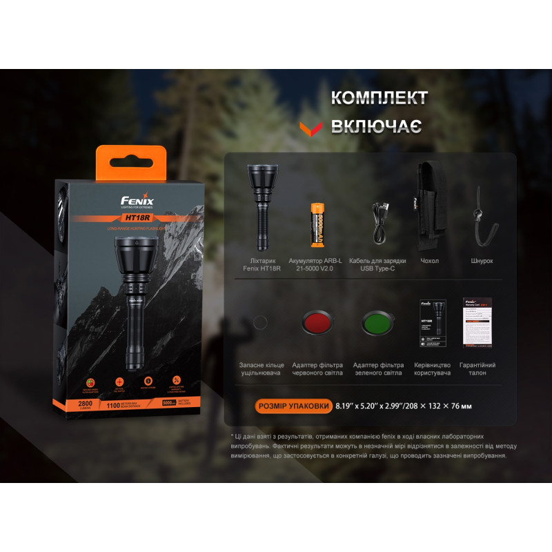 Ліхтар Fenix HT18R, li-ion акумулятор, кабель USB Type-C для заряджання, 2 світлофільтри (червоний, зелений), запасне ущільнювальне кільце, темляк на руку, чохол, гарантійний талон та інструкція користувача.