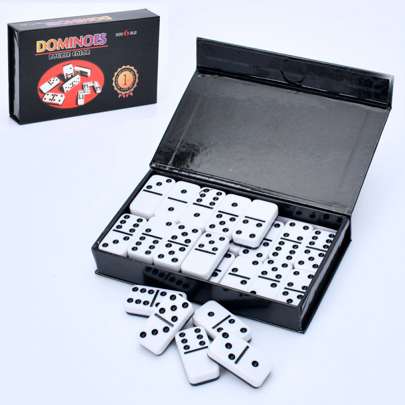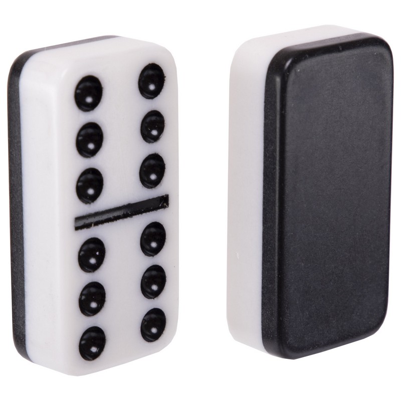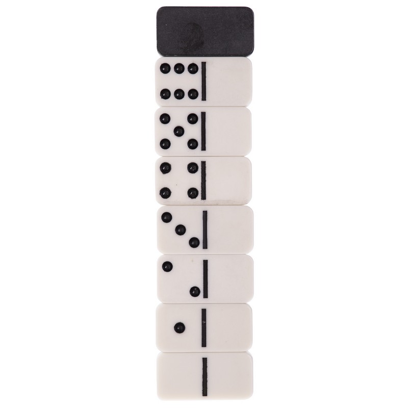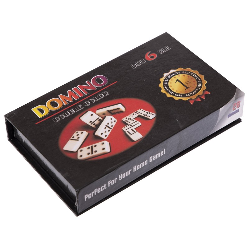 Это домино представляет собой стандартный набор из 28 костяшек, имеющих традиционный вид – разделённая надвое лицевая сторона с определённым количеством точек и одинаковые «спинки». Костяшки изготовлены из высококачественного пластика, характеризующегося чрезвычайной прочностью. Благодаря этому они способны выдержать практически любые удары о стол, которые часто случаются в пылу игры. Для хранения костяшек предусмотрена аккуратная компактная коробка, изготовленная из ламинированного картона.