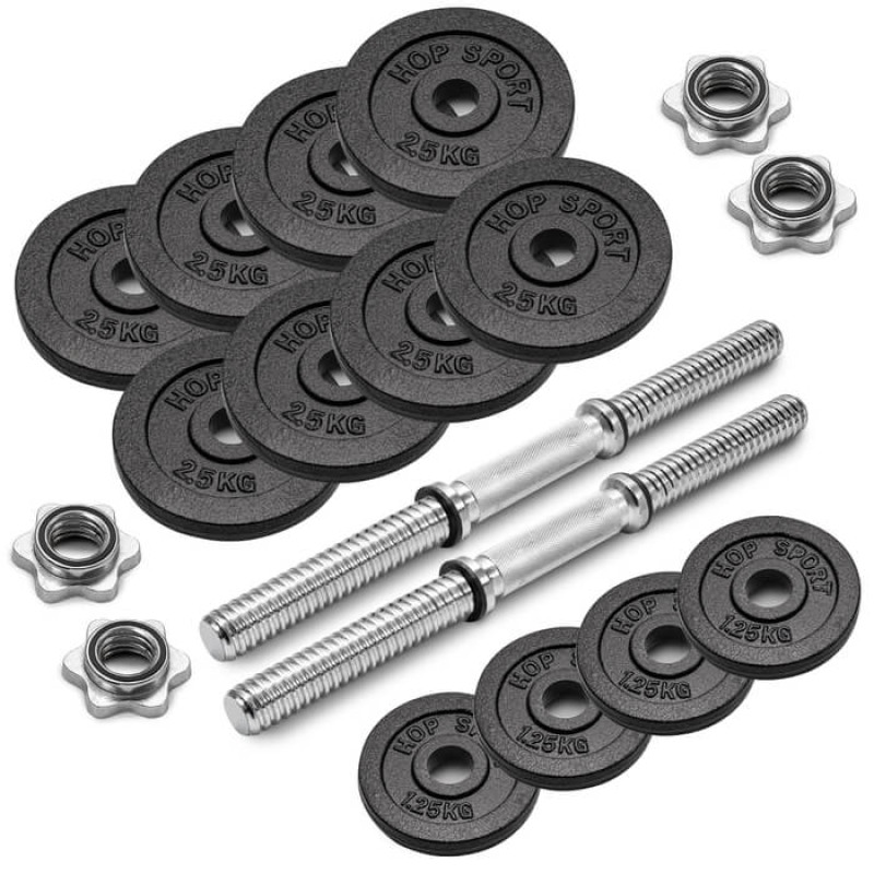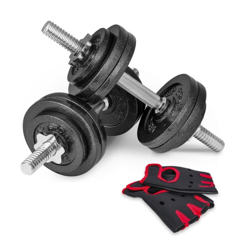 Гантели состоят из стальных грифов (хромированных, с резьбой) и прочных металлических дисков. Также они обладают рифлеными ручками, которые предотвращают скольжение в руках пользователя во время тренировки.