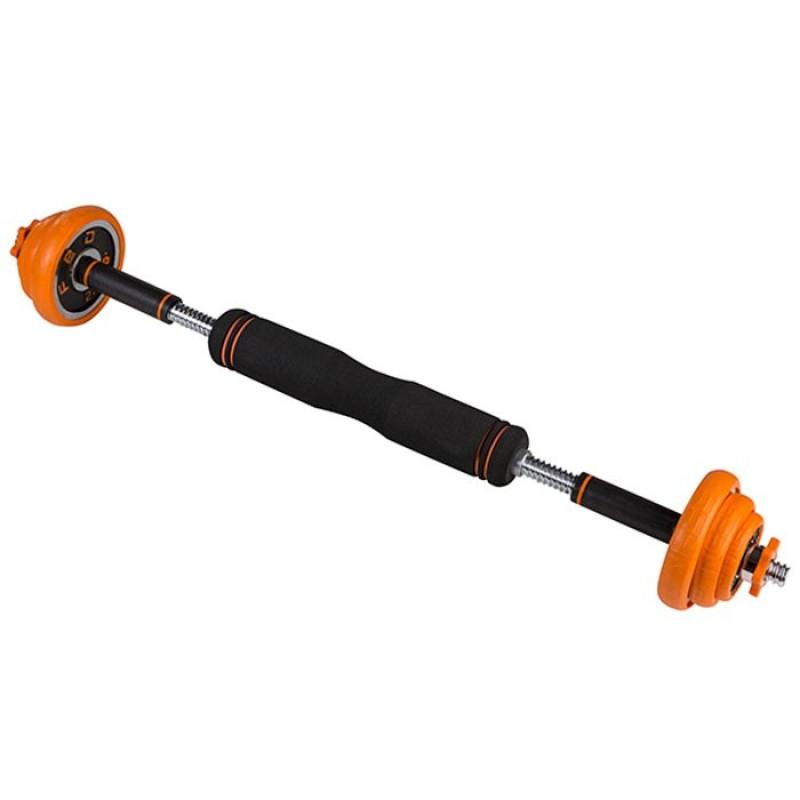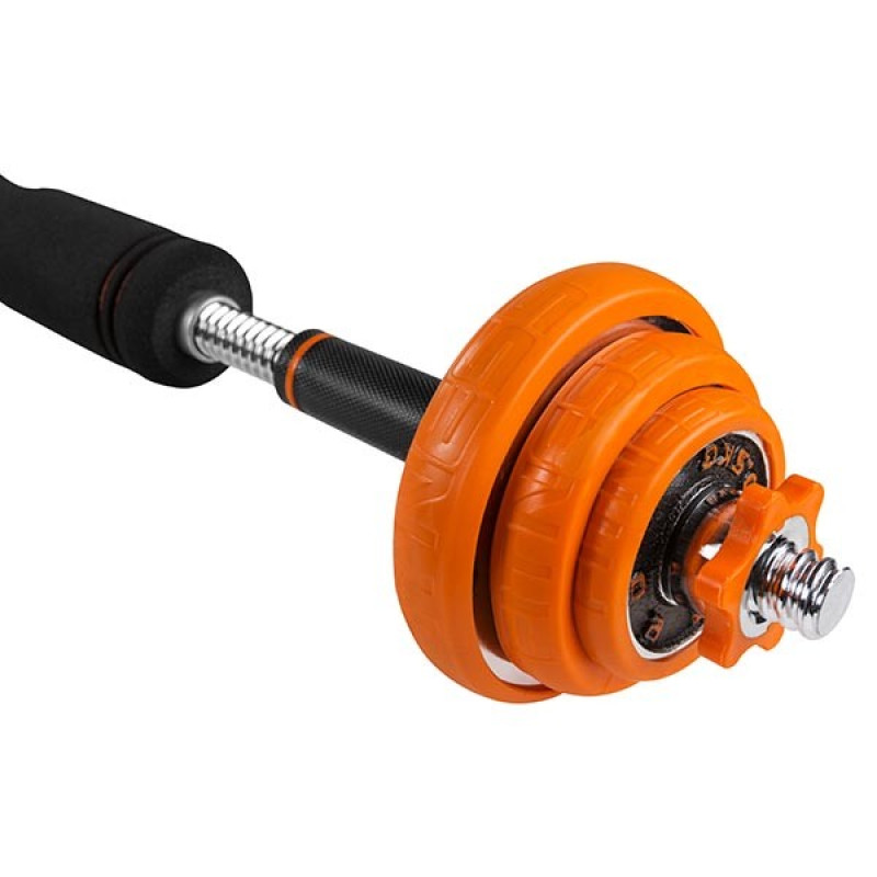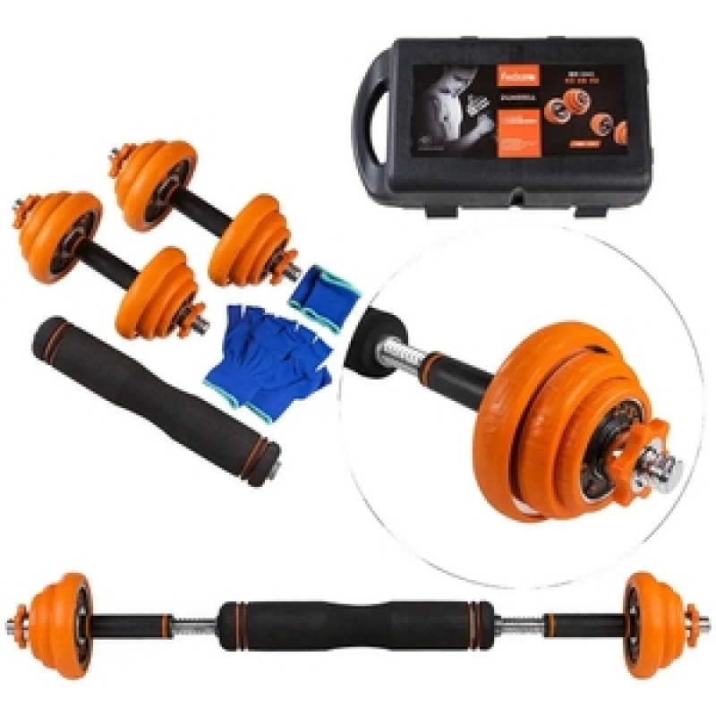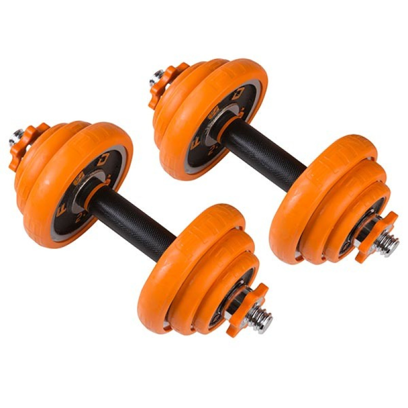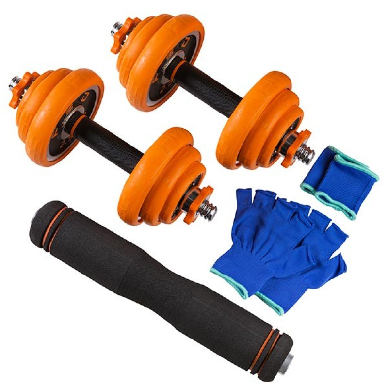 Гантельные наборные, хромированные с расширителем. На блины надеваются силиконовые накладки оранжевого цвета, чтобы предотвратить повреждения пола. В комплект также входят пара трикотажных перчаток без пальцев и напульсники.