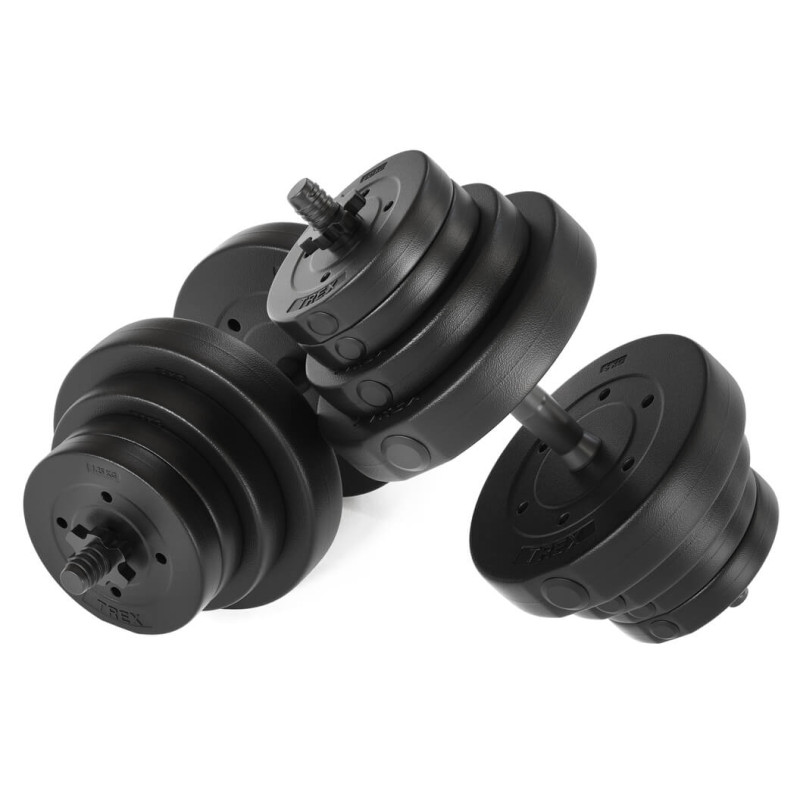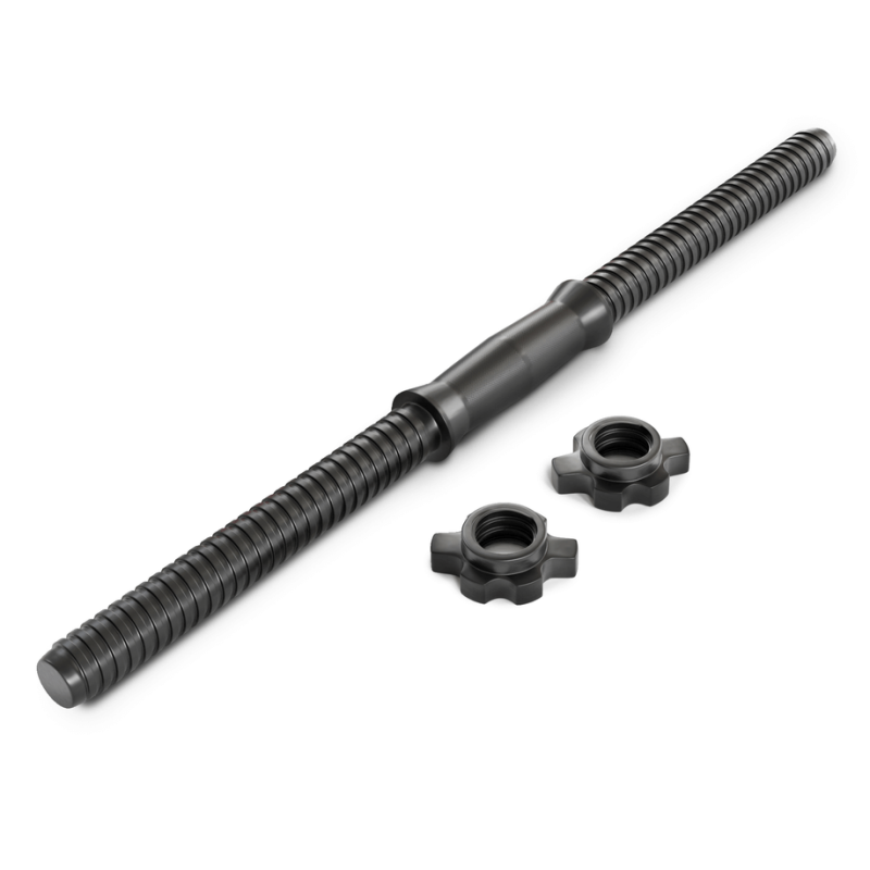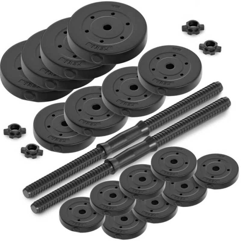 Набор включает в себя целых 16 дисков, поэтому вы можете свободно регулировать нагрузку, подбирая вес гантели в соответствии со своими потребностями и навыками. В комплект также входят прямые металлические грифы, покрытые особым пластиком, и 4 гайки с нарезной резьбой.