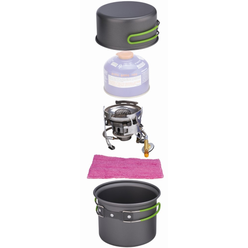 Ці практичні казанки і пальник у комплекті полегшать процес приготування їжі в польових умовах. Відмінна річ для туристів, любителів активного відпочинку серед дикої природи. У наборі передбачена м'яка серветка.