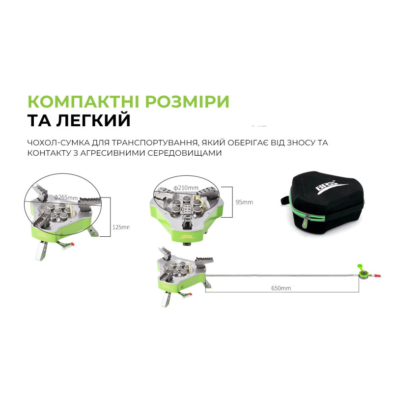 За зручність експлуатації відповідають три складані стійки для посуду та три металеві ніжки. Зубчаста кромка стійок сприяє надійному утриманню казанка на поверхні без ковзання, а ребристі ніжки підвищують стійкість конструкції незалежно від рельєфу поверхні. Після встановлення висота конструкції дорівнює 125 міліметрам, а діаметр — 265 міліметрам, тому на пальник зручно встановлюється широкий посуд підвищеного об'єму. У складеному вигляді габарити моделі становлять 210 х 95 міліметрів при вазі 1.1 кілограм.