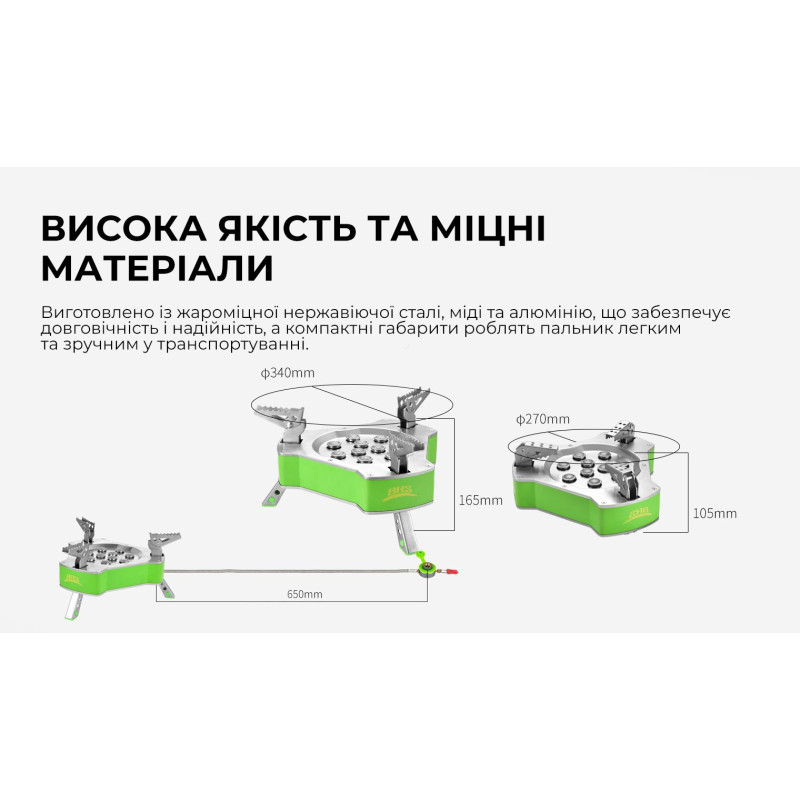 Матеріали: жароміцна нержавіюча сталь, мідь, алюміній. Компактні габарити: розмір моделі становить 270*105 мм, а важить вона 1,85 кг. Висота пальника дорівнює 165 міліметрів. Передбачено сумку для зручного зберігання виробу.