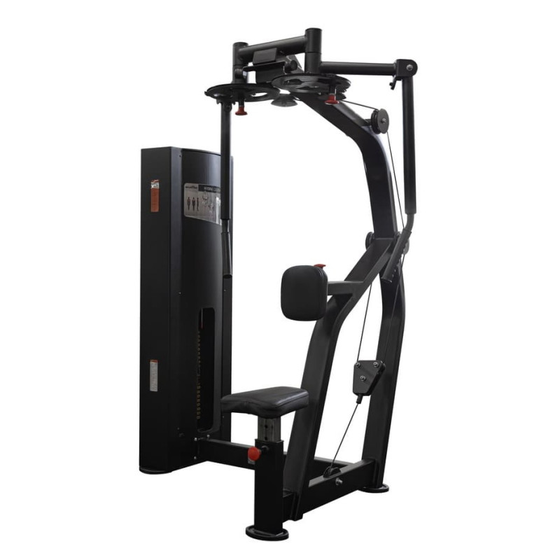 - Функциональность: Тренажер объединяет упражнения на грудные мышцы и задние дельты, позволяя комплексно прорабатывать плечевой пояс.