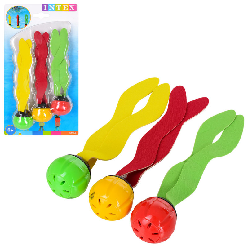 Набор для подводной игры Водоросли Intex 55503 состоит из шариков с лепестками в виде водорослей с грузилом. Задача родителей разместить игровые снаряды в разных местах бассейна, цель детей — максимально быстро их собрать и выиграть.