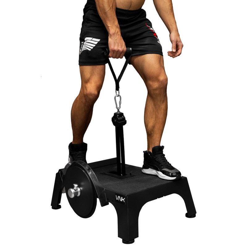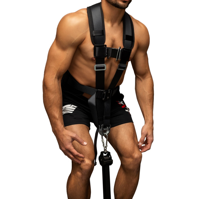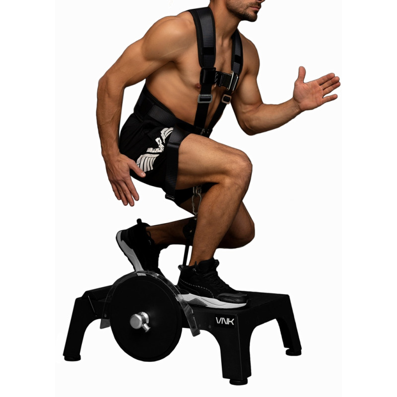 Інерційний тренажер VNK укомплектований ремінним жилетом-портупеєю, лямкою і прямим грифом для тяги.
