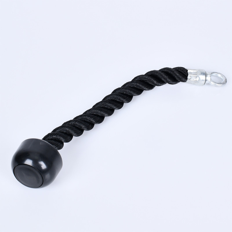 Основой канатной рукояти является прочный плетёный трос из высококачественного полипропиленового волокна. С одной стороны к нему прикреплён прочный металлический подвес с проушиной под карабин, что позволяет использовать данный аксессуар практически на любом блочном тренажёре. С другой надёжно зафиксирован большой резиновый упор для предотвращения соскальзывания руки во время тренировки.
