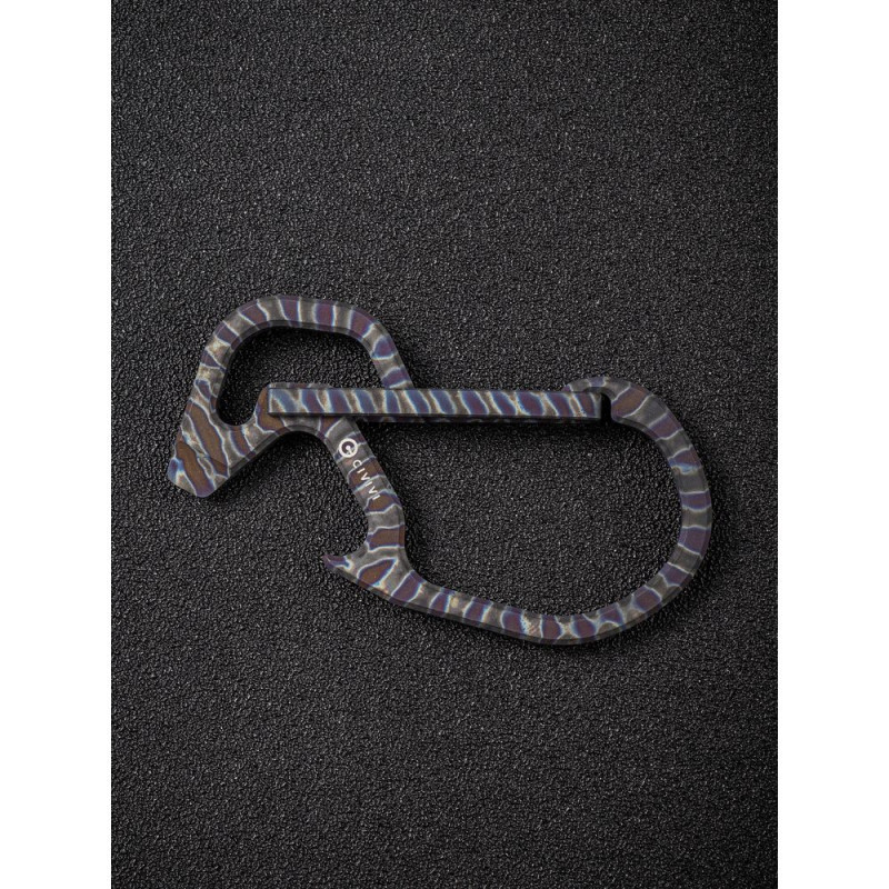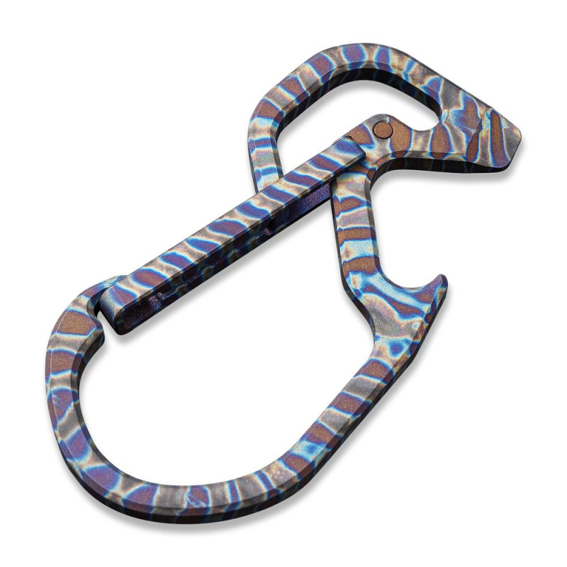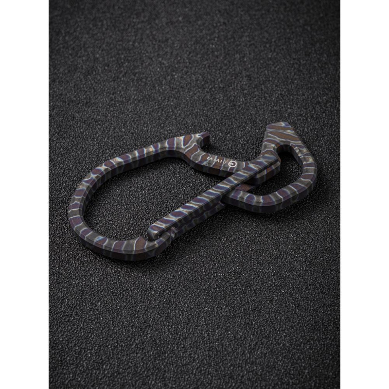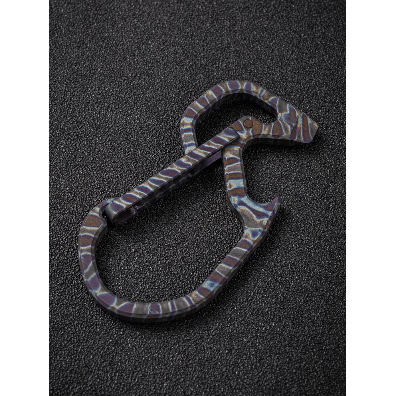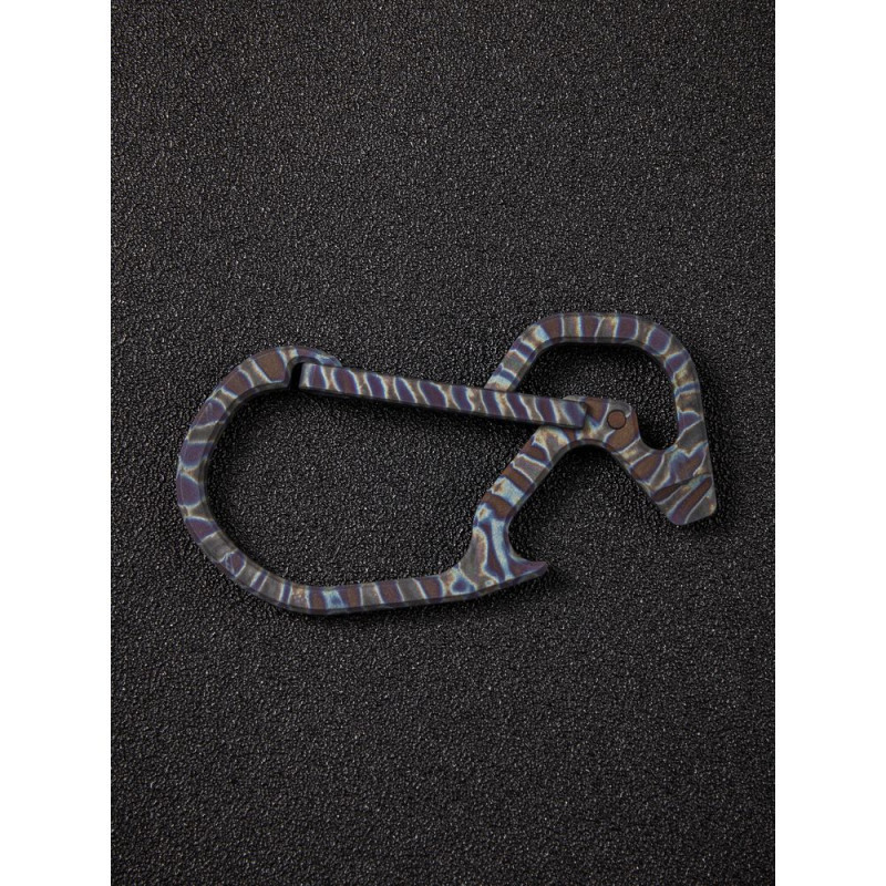 Конструкція виготовлена з немагнітного титанового сплаву 6AL4V, який демонструє високу твердість та опір зношування, тому карабін не боїться високих навантажень. Метал має додаткове анодоване покриття, завдяки якому поверхню покривають кольорові візерунки.