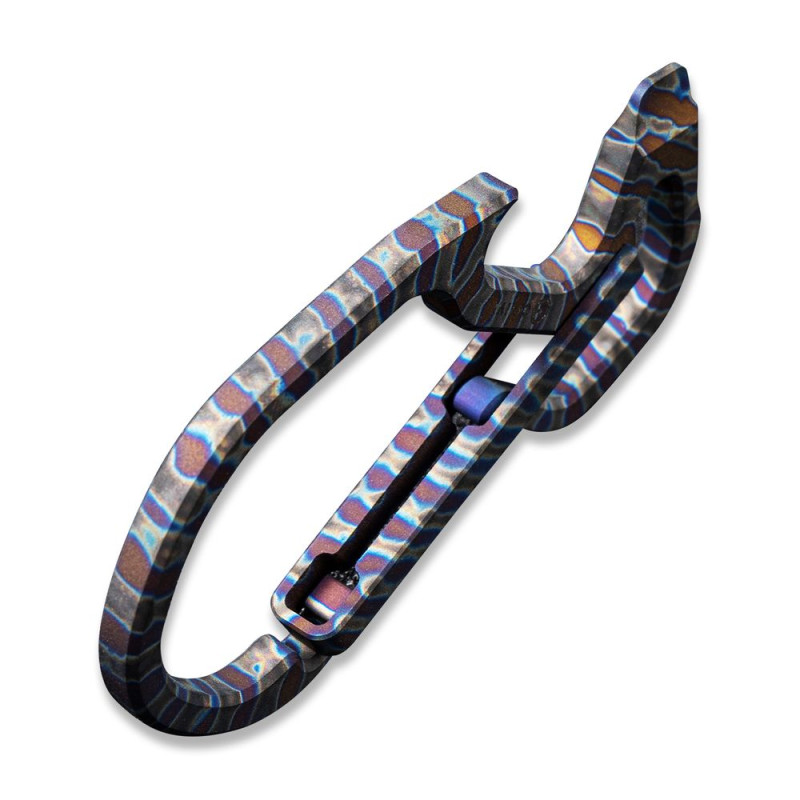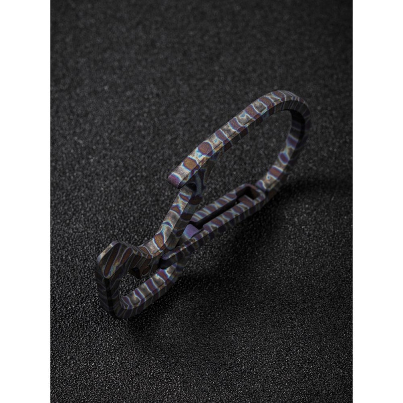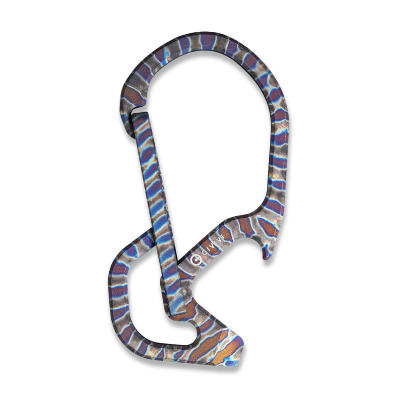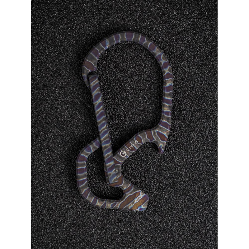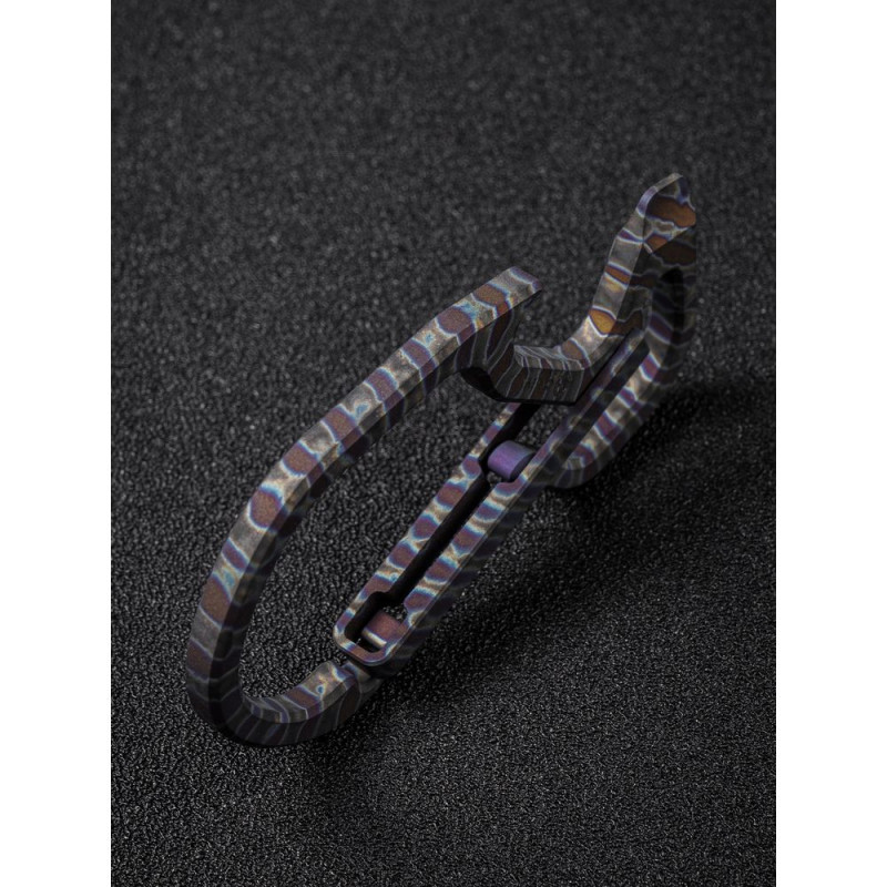 Конструкція виготовлена з немагнітного титанового сплаву 6AL4V, який демонструє високу твердість та опір зношування, тому карабін не боїться високих навантажень. Метал має додаткове анодоване покриття, завдяки якому поверхню покривають кольорові візерунки.