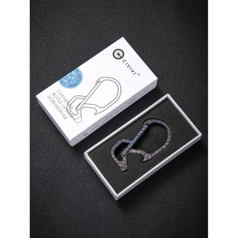 Карабін поставляється у фірмовому пакуванні Civivi. Розміри виробу такі: довжина становить 58 мм, а товщина — 5.9 мм. Аксесуар важить лише 8.6 г.