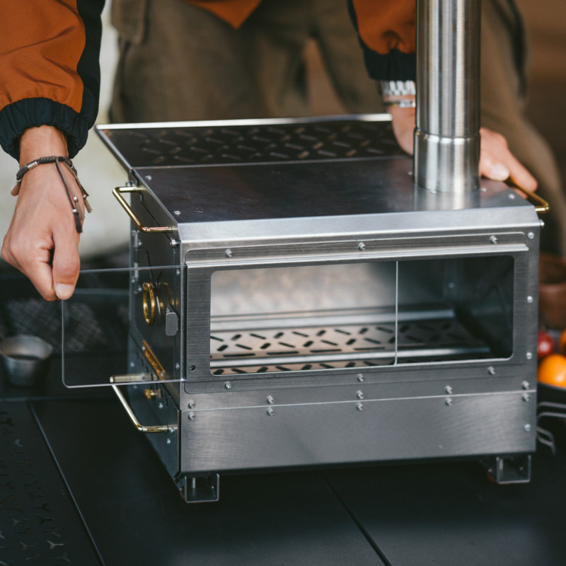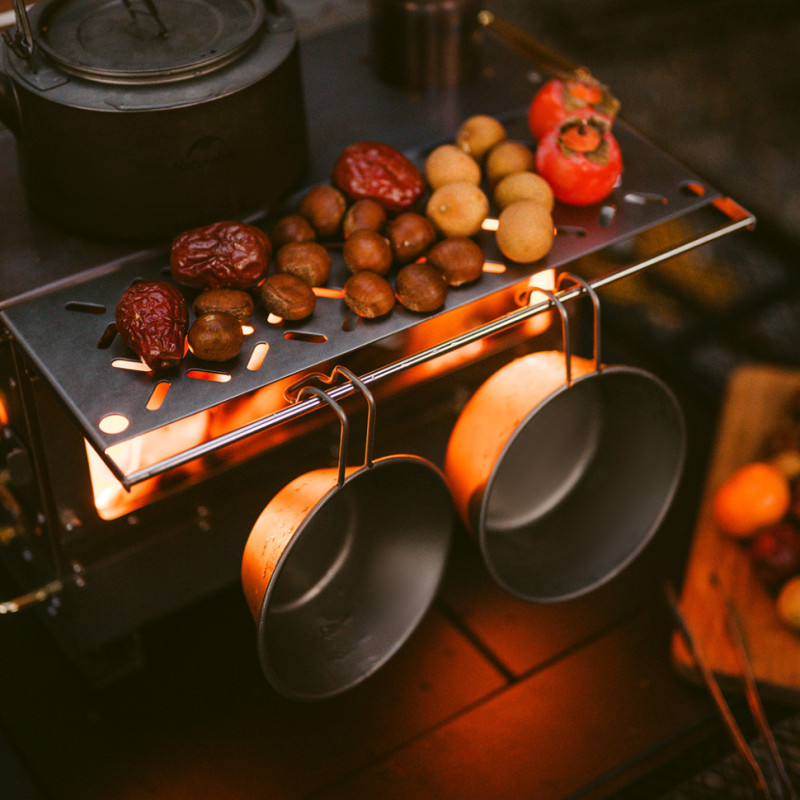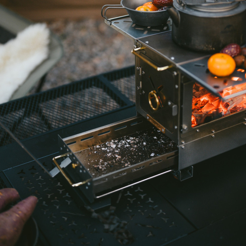 Для роботи печі використовуються дрова, які закладаються через бічні дверцята з ручкою-кільцем. На двох складаних підставках легко розмістити туристичний посуд чи харчові продукти. У такий спосіб ви можете одночасно кип'ятити воду, готувати гарячі страви та запікати овочі. Імпровізовані ручки на підставках дозволяють підвішувати дрібне приладдя, додаючи зручності під час готування та дозволяючи тримати все необхідне під рукою.