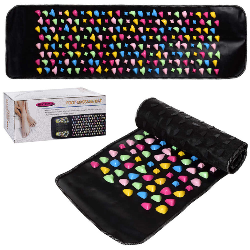Коврик изготовлен из высококачественного поливинилхлорида (PVC), прочного и устойчивого к износу, но при этом достаточно мягкого, чтобы аксессуар можно было свернуть в компактный рулон. Непосредственно полезное воздействие оказывают пластиковые камни разных размеров, которые наклеены на поверхность коврика.Они образуют три участка, где один – это сплошная «россыпь», по которой можно походить, а два других повторяют форму ступней – для статичного воздействия на подошвы ног. Также на коврик нанесена схема, показывающая, на что в большей степени оказывает воздействие тот или иной камень.