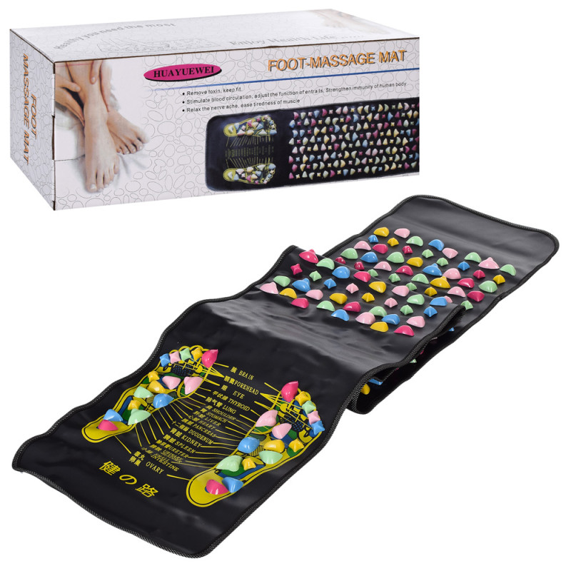Коврик изготовлен из высококачественного поливинилхлорида (PVC), прочного и устойчивого к износу, но при этом достаточно мягкого, чтобы аксессуар можно было свернуть в компактный рулон. Непосредственно полезное воздействие оказывают пластиковые камни разных размеров, которые наклеены на поверхность коврика.Они образуют три участка, где один – это сплошная «россыпь», по которой можно походить, а два других повторяют форму ступней – для статичного воздействия на подошвы ног. Также на коврик нанесена схема, показывающая, на что в большей степени оказывает воздействие тот или иной камень.