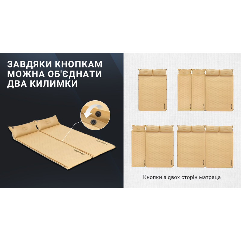 В цьому килимку реалізована технологія самонадування. Зазвичай, у згорнутому стані він компактний і плоский. Спочатку потрібно відкрити повітряний клапан, щоб матрац ввібрав повітря, а потім надути килимок. Після цього повітряний клапан закривається, щоб повітря не потрапляло.