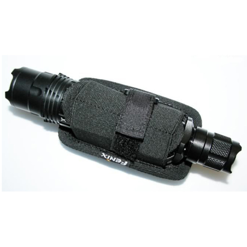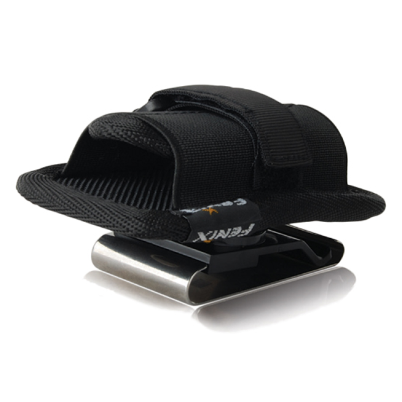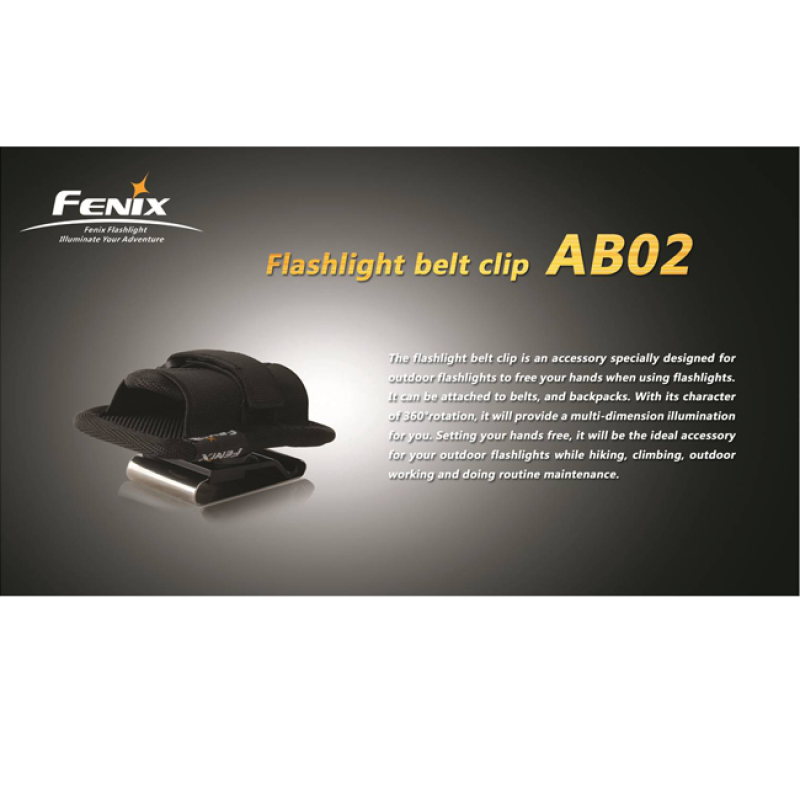 Оригінальна кліпса-тримач для ліхтарів AB02 від компанії Fenix. Модель AB02 являє собою широку кліпсу з нержавіючої сталі, яку слід кріпити на ремені (з укріпленим на ній чохлом із синтетичної тканини). На бічній поверхні чохла розташований ремінь на застібці «велкро» (іншими словами, «липучка»), який дозволяє надійно зафіксувати ліхтар всередині.