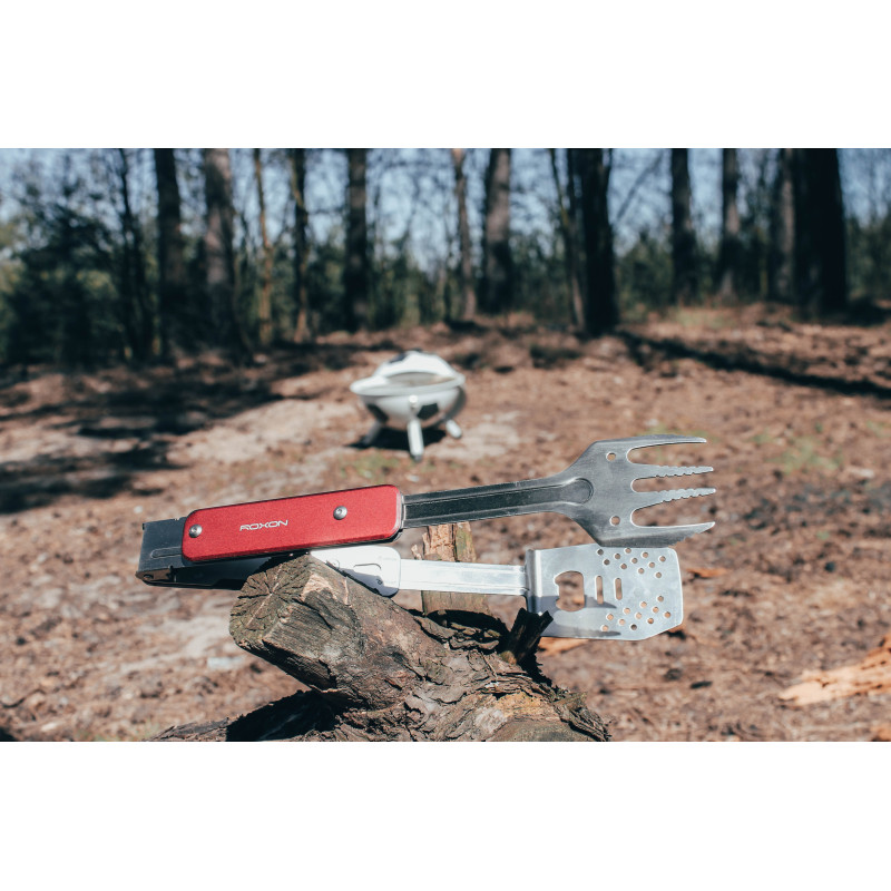 Модель Multi BBQ Tool MBT MINI S602 від бренду Roxon – це компактна версія мультиинструмента для приготування барбекю. Він складається з металевих лопатки і виделки, які можуть використовуватися як самостійні інструменти, а разом утворюють зручні щипці. Крім того, в інструмент вбудована проста відкривачка для пляшок.