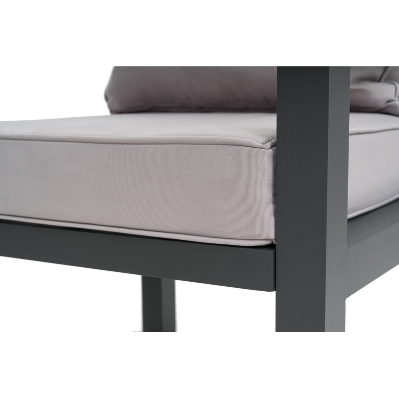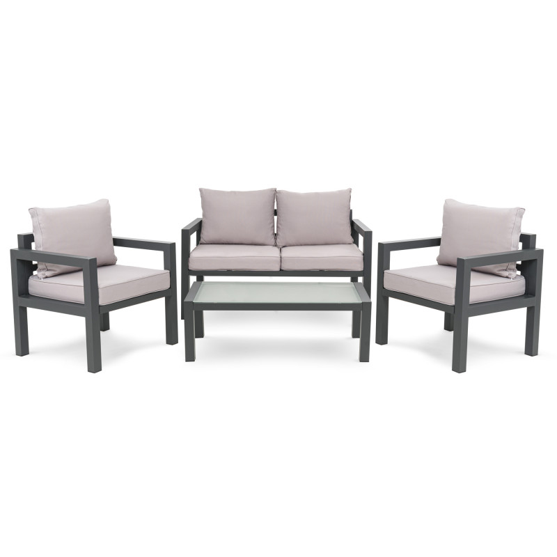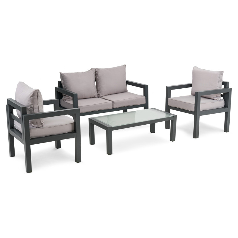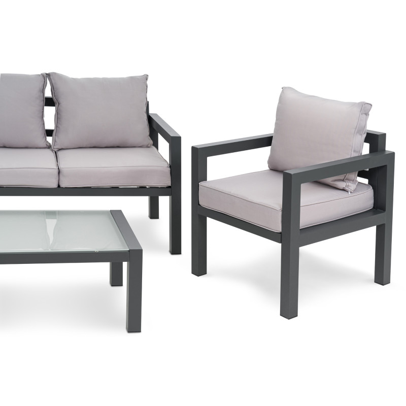 Садовая мебель Brescia 2 от Di Volio - это гарантия высокого качества и хорошего отдыха в теплые летние дни. Элегантный, минималистичный дизайн мебели идеально подойдет практически к любому оформлению сада или террасы. Комплект изготовлен из устойчивого к атмосферным воздействиям, прочного алюминиевого каркаса с порошковым покрытием, который гарантирует долговечность мебели в течение многих лет. Набор состоит из двух удобных кресел, двуместного дивана и журнального столика с элегантной столешницей из молочного стекла. И кресла, и диван укомплектованы мягкими подушками серого цвета с пропиткой.